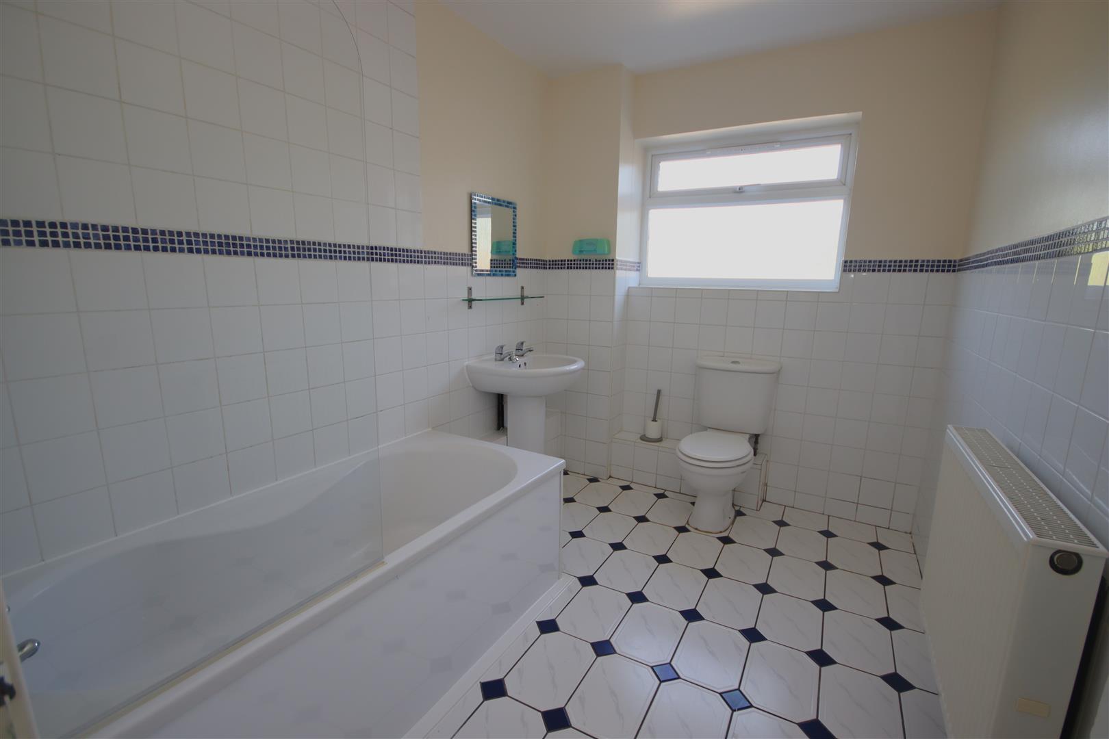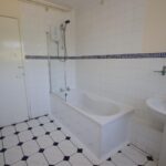 Spacious downstairs bathroom with electric shower over bath, WC and hand basin