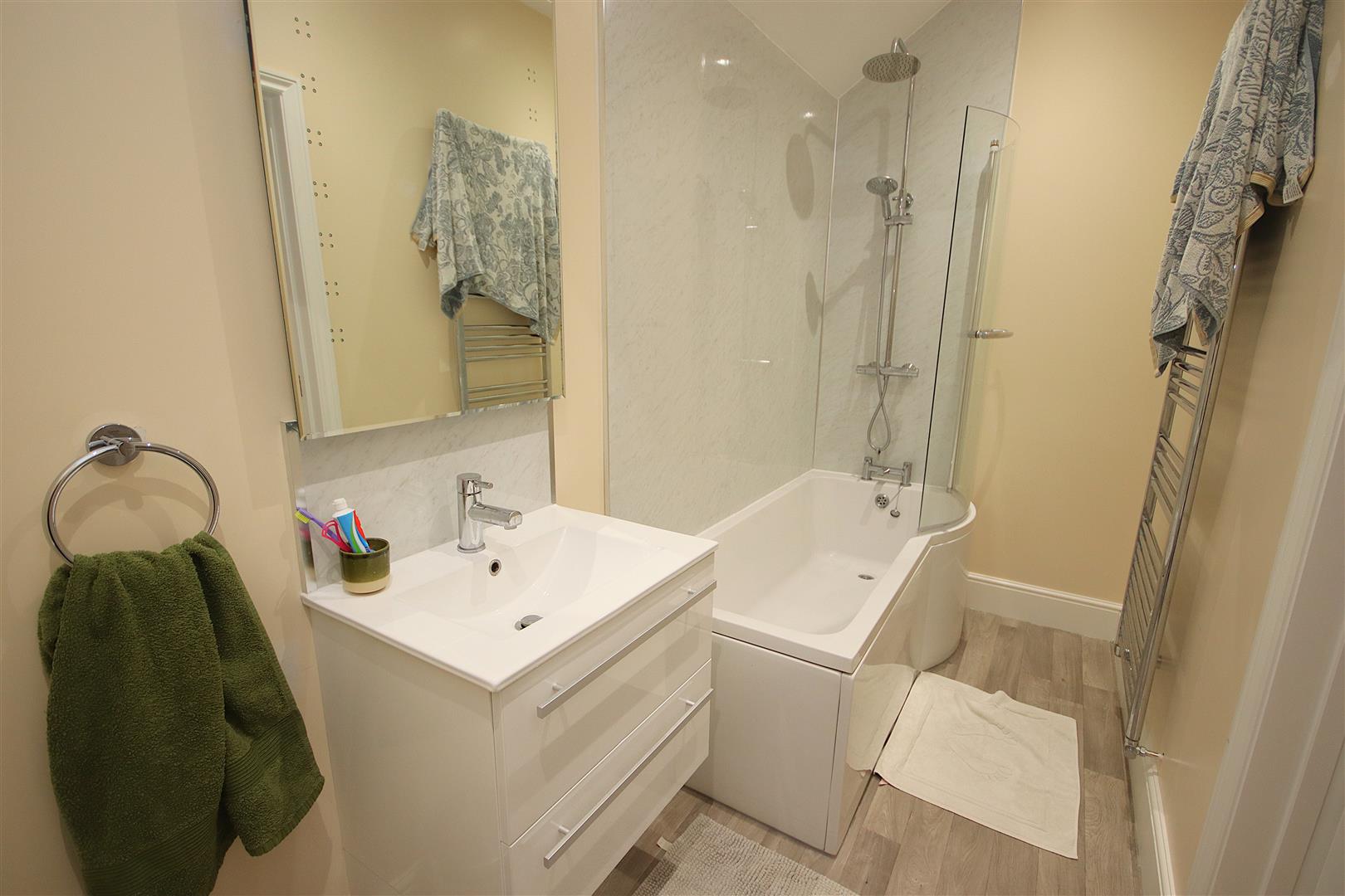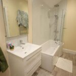 Modern bathroom with shower over bath, WC, heated towel rail and hand basin with storage and mirror