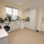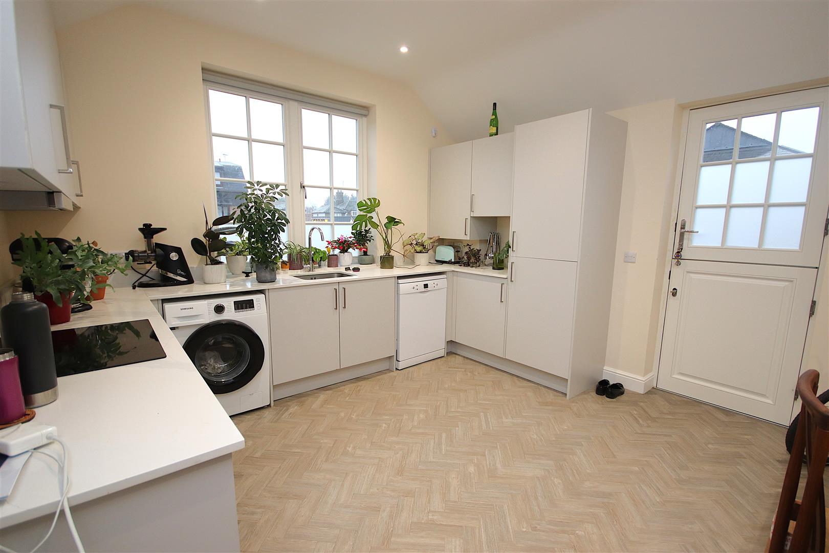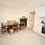 Open plan kitchen/dining room with herringbone effect laminate flooring. The kitchen is equipped with electric hob and oven with pull out Bosch extractor fan and integrated fridge freezer. There is space for a washing machine and dishwasher but they are not supplied.