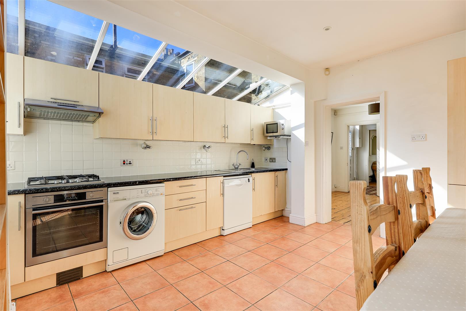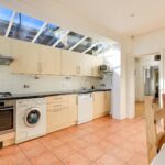 The entrance door is tucked away quietly at the side of the house, with an original stained glass panel, and leads to a hallway with quarry tiled floor and stairs rising to the first floor with a useful under stairs cupboard and cloakroom with w.c below. The beautifully proportioned living room is located at the front with a large bay window, period fireplace with alcove shelving and exposed wooden floor. There is a separate dining/family room with period fireplace and alcove storage to both recesses as well as exposed wooden floor and door to the kitchen. The kitchen/dining room is a light filled space running the full width of the house at the back with a partially glazed roof and double doors to the garden. There is a range of wall and base units and work surfaces with integrated electric oven and gas hob with extractor over, plumbing for washing machine and dishwasher in addition to tiled flooring and a concealed wall mounted gas fired boiler.