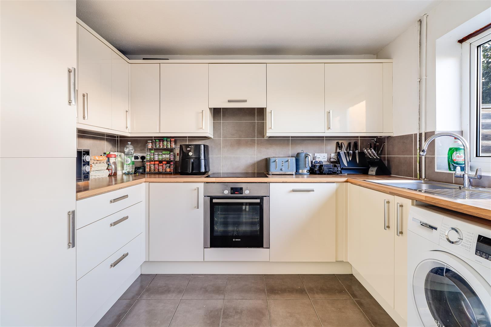 In brief, the accommodation consists of: A porch leads to a wide entrance hallway, with stairs rising to the first floor. The living room has wood-effect flooring and is a light and airy room with a large window to the front aspect. The re-fitted kitchen is modern in design, there is a range of matching cabinets and drawers, an integrated oven, a 4-ring hob with extractor above, ample work surfaces, an integrated dishwasher and fridge freezer, space and plumbing for an appliance, and an under-stair storage cupboard. There is space for a dining table and chairs, and patio doors lead out to the rear garden.
