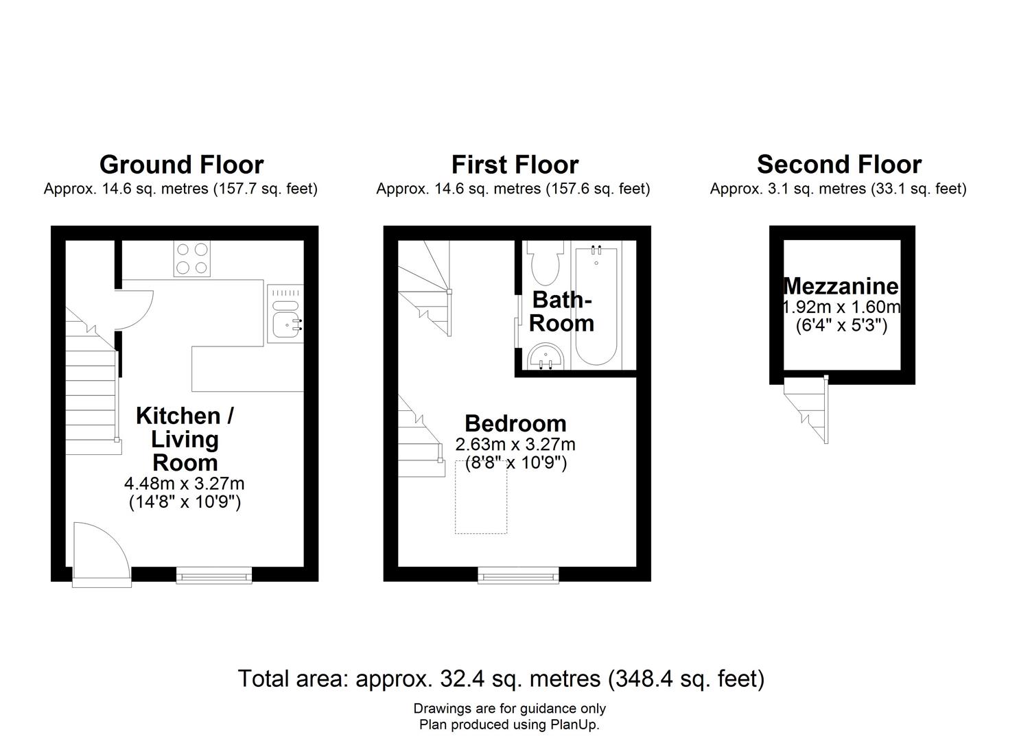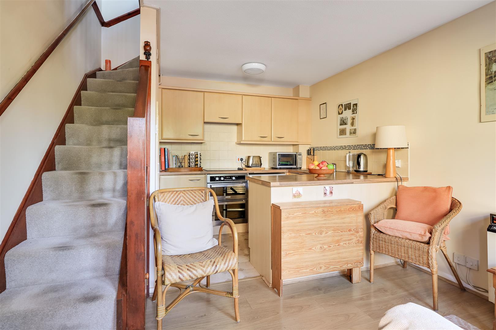 The entrance door takes you into the kitchen/living room which occupies the ground floor with a fitted range of wall and base units and work surfaces, integrated electric double oven and hob with extractor over, stainless steel sink and drainer, plumbing for washing machine and under cabinet fridge. There is a window to front aspect, electric storage heater and stairs to the first floor with a useful under stairs cupboard which also contains the hot water tank.
