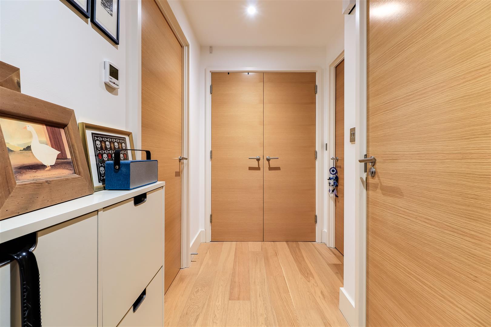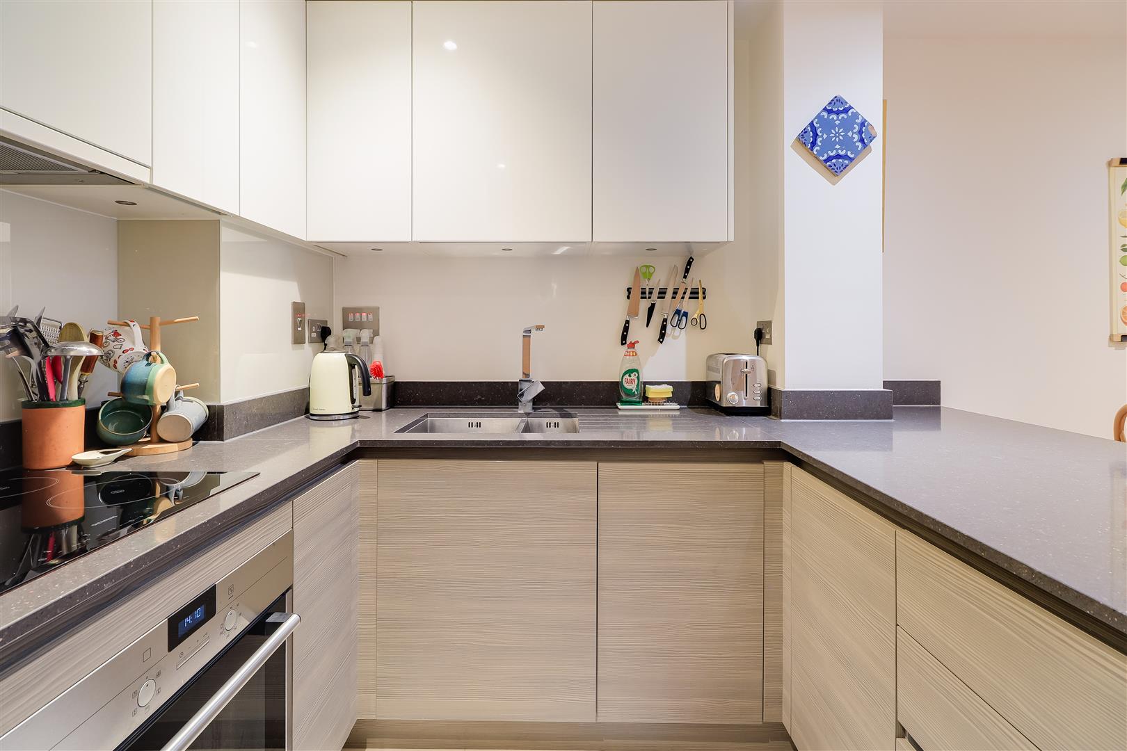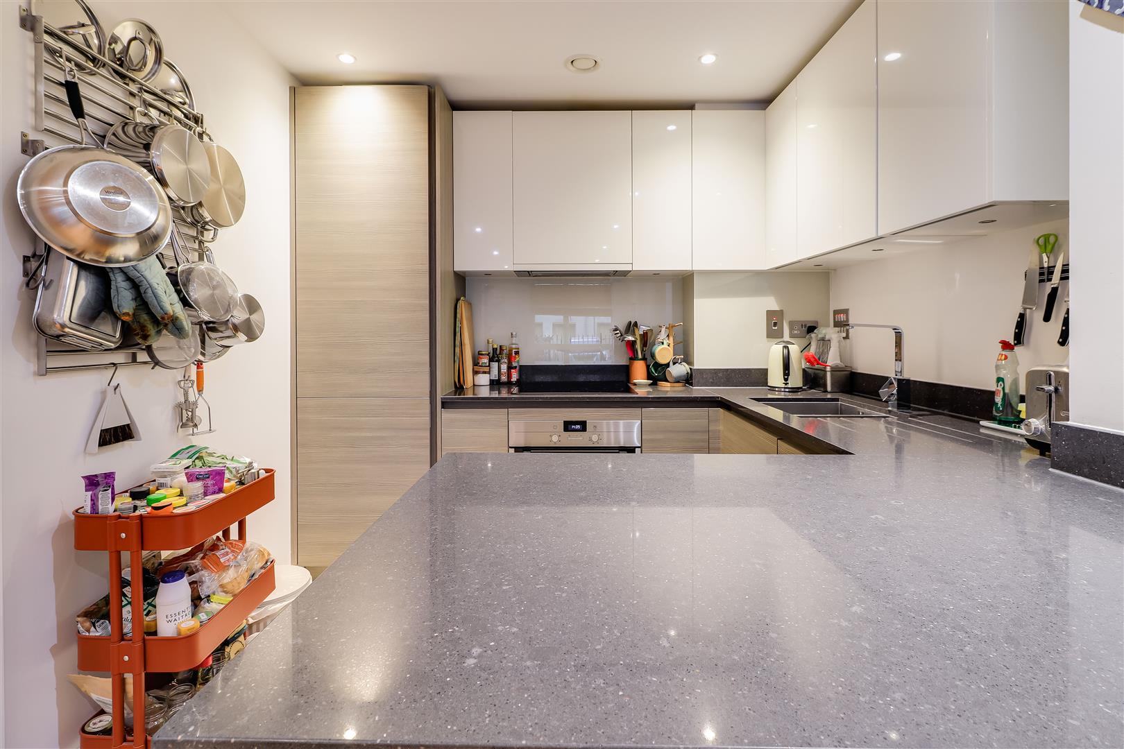 Secure communal entrance hall, also a private door leading to the sitting room from the terrace. Sitting/ dining room with timber flooring and inset lighting, kitchen fitted with a sink unit and a matching range of wall and base units, induction hob, electric oven, fridge/freezer, extractor hood and inset lighting. Hall with a cupboard with plumbing for a washer dryer, timber flooring. Double bedroom with double wardrobe, inset lighting and double-glazed window to front elevation. Bathroom with a paneled bath and rainfall shower over, hand basin, WC, inset lighting and towel rail.