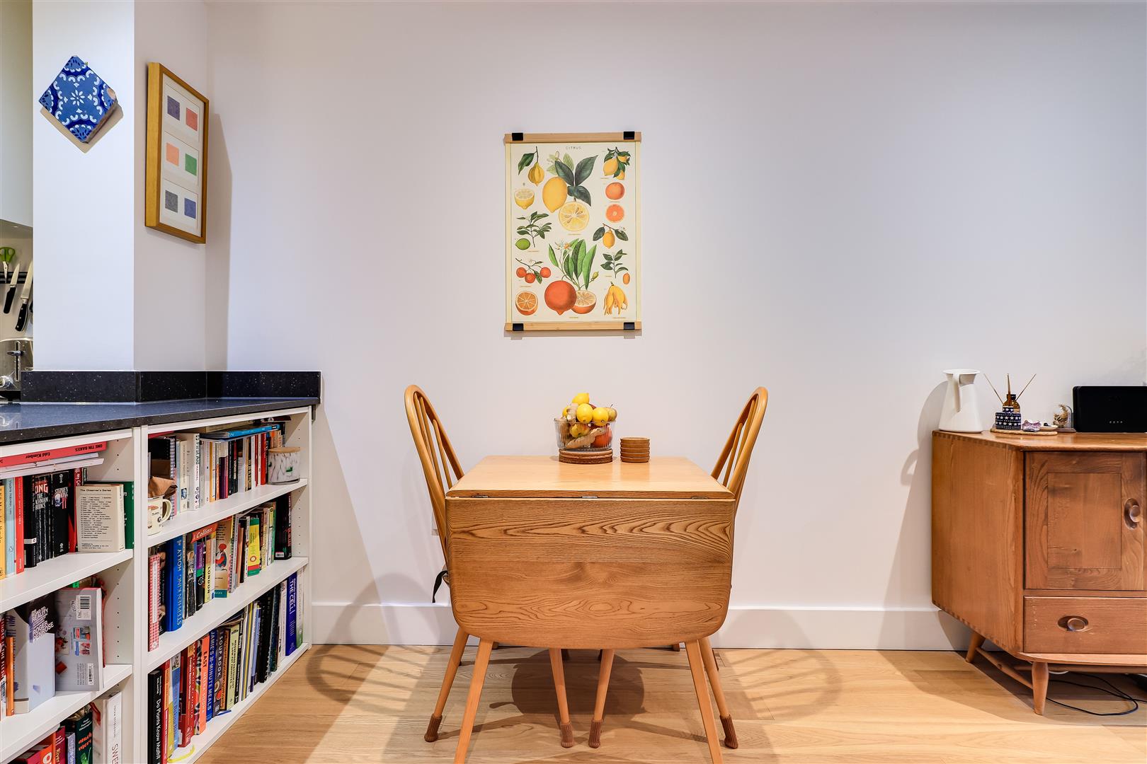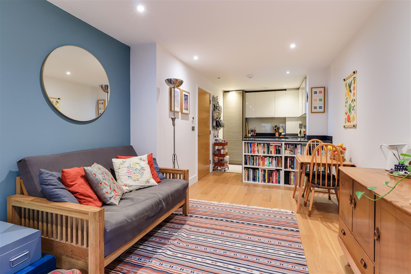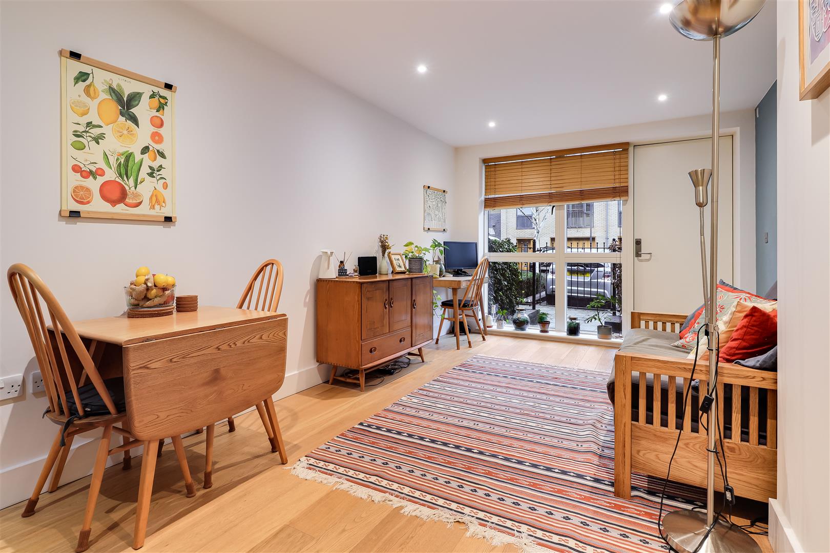 Secure communal entrance hall, also a private door leading to the sitting room from the terrace. Sitting/ dining room with timber flooring and inset lighting, kitchen fitted with a sink unit and a matching range of wall and base units, induction hob, electric oven, fridge/freezer, extractor hood and inset lighting. Hall with a cupboard with plumbing for a washer dryer, timber flooring. Double bedroom with double wardrobe, inset lighting and double-glazed window to front elevation. Bathroom with a paneled bath and rainfall shower over, hand basin, WC, inset lighting and towel rail.