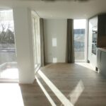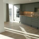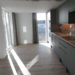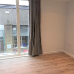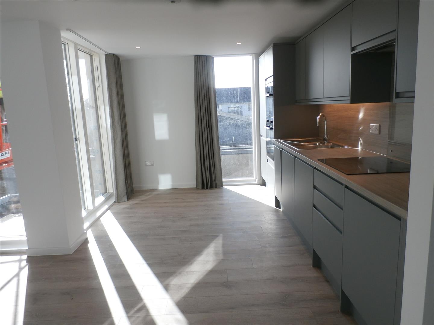 Spacious living area with door to rear balcony and fully integrated kitchen with electric hob and oven, dishwasher, washer-drier and fridge-freezer