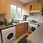 Fitted kitchen with freestanding fridge freezer, gas hob and electric oven, washing machine and extractor fan
