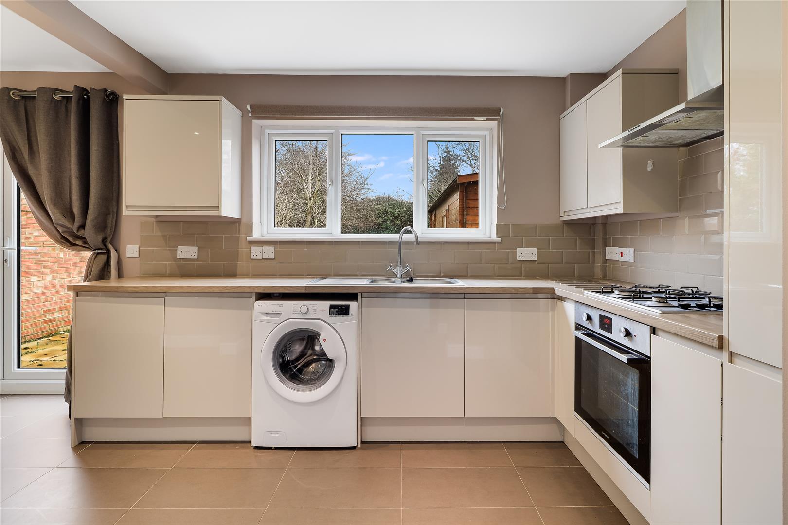 Accommodation in detail. Ground floor, UPVC front door, sitting room with large picture window to front elevation, stairs to first floor, laminate flooring and radiator. Kitchen/ dining room with a one-and-a-half sink unit with a range of matching wall and base units, gas hob, electric oven, inset lighting, washing machine, fridge space, French doors to the rear garden, tiled flooring, under-stairs cupboard and door to side driveway. First floor landing with access to loft space, cupboard housing gas fired combination boiler serving hot water and central heating. Bedroom 1 with fitted wardrobes, inset lighting and radiator, bedroom 2 with inset lighting and radiator, bedroom 3 with inset lighting and radiator. Bathroom with a panel bath with a shower over, hand basin, tiled walls, extractor fan and radiator. Separate WC.
