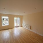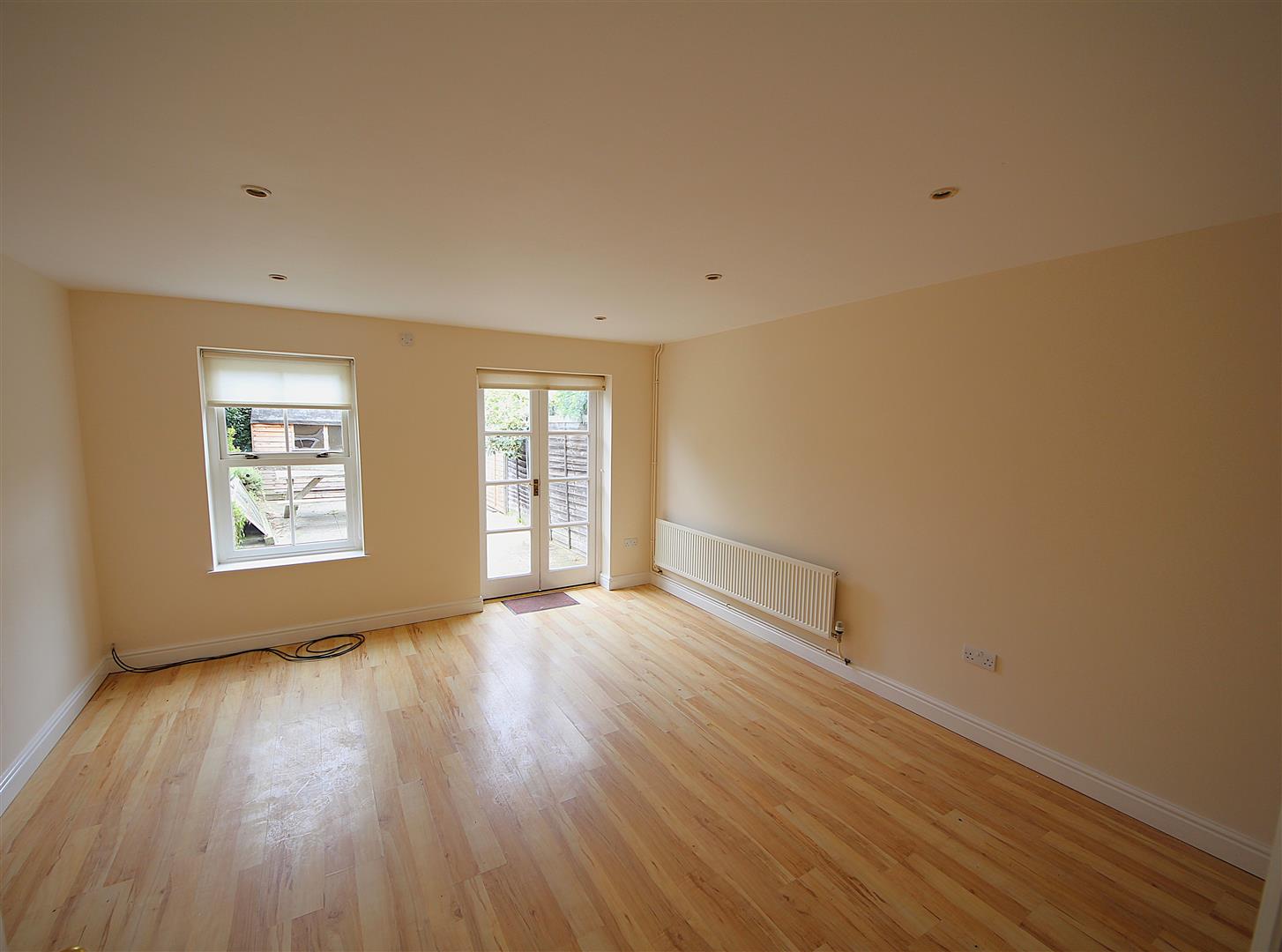 Spacious rear living room with laminate flooring and doors to patio garden