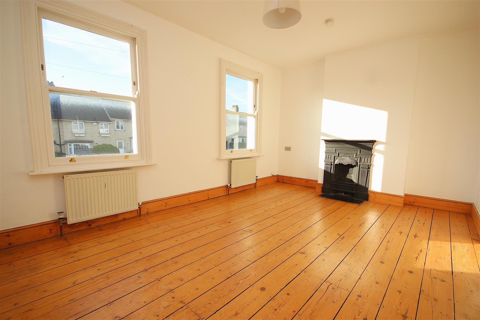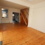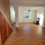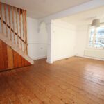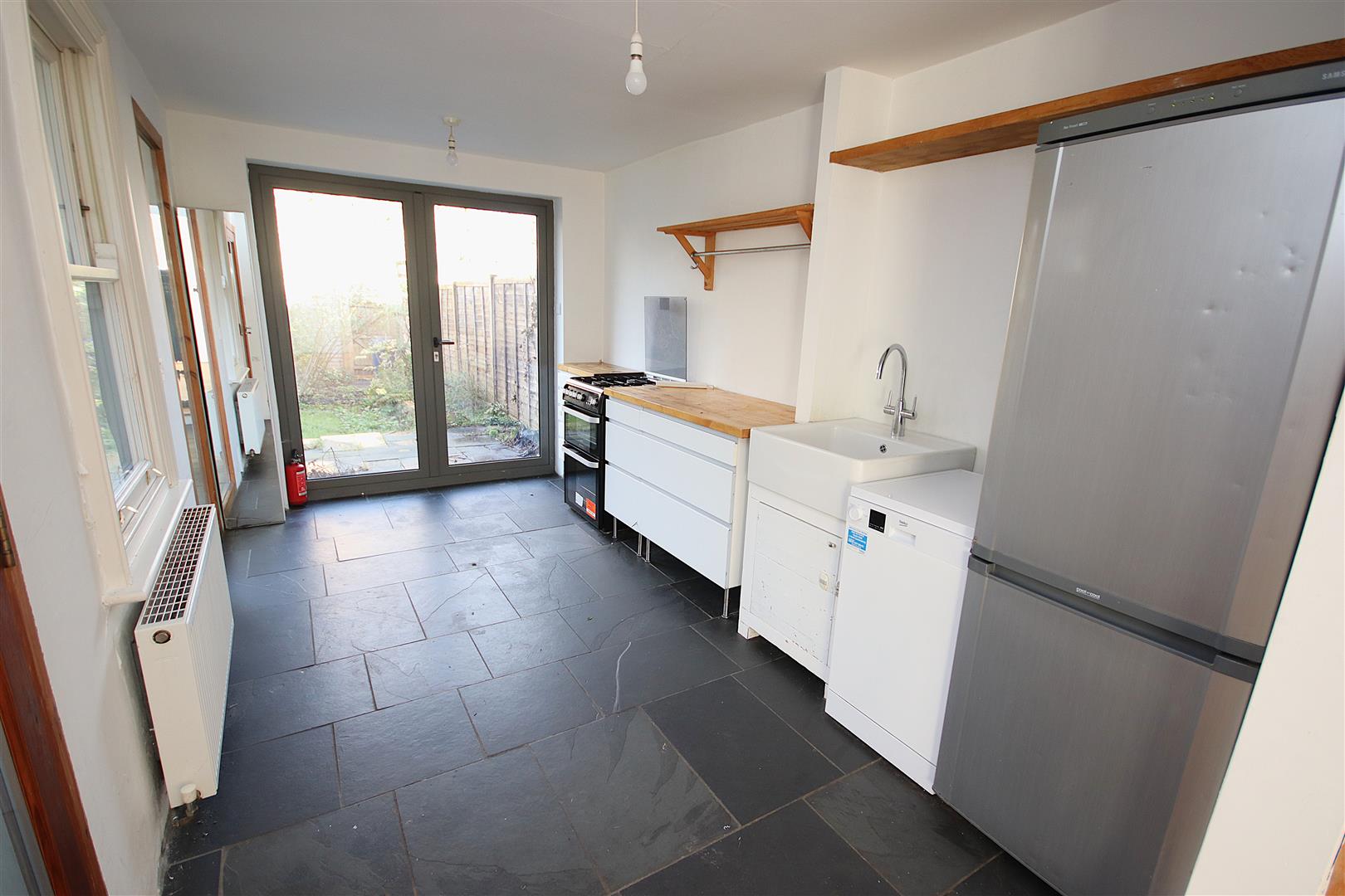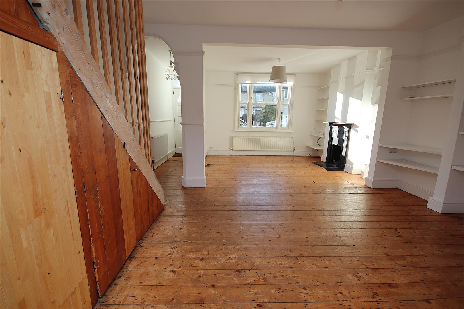 Spacious open plan living/dining room leading through to the kitchen. This generously sized living space has an old Victorian fire place which is for decorative use only and lots of bookshelf storage, along with under stairs storage housing the washing machine.