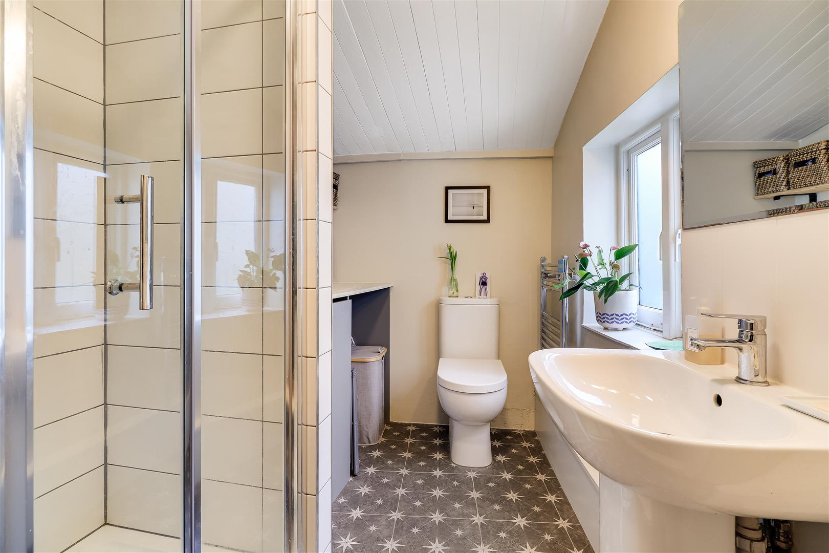 The modern re-fitted three piece shower room additionally includes plumbing for a washing machine, air extractor and chrome heated towel rail.