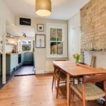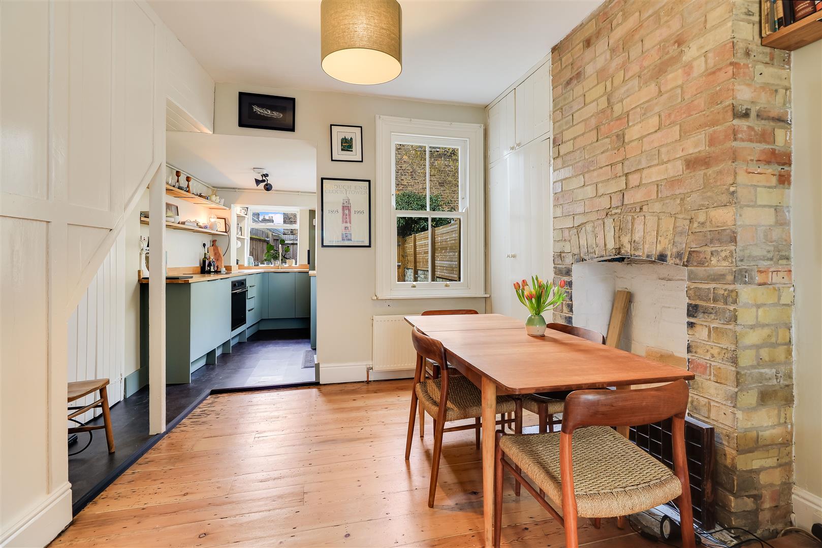 The exceptional living/dining space features original wood flooring and exposed brick fireplace apertures. The sleek re-fitted kitchen comprises a modern range of units with oak work surfaces, inset sink with boiling tap and fitted shelving. There are integrated appliances including an electric oven and hob, fridge and dishwasher as well as a concealed wall mounted gas fired boiler.