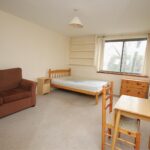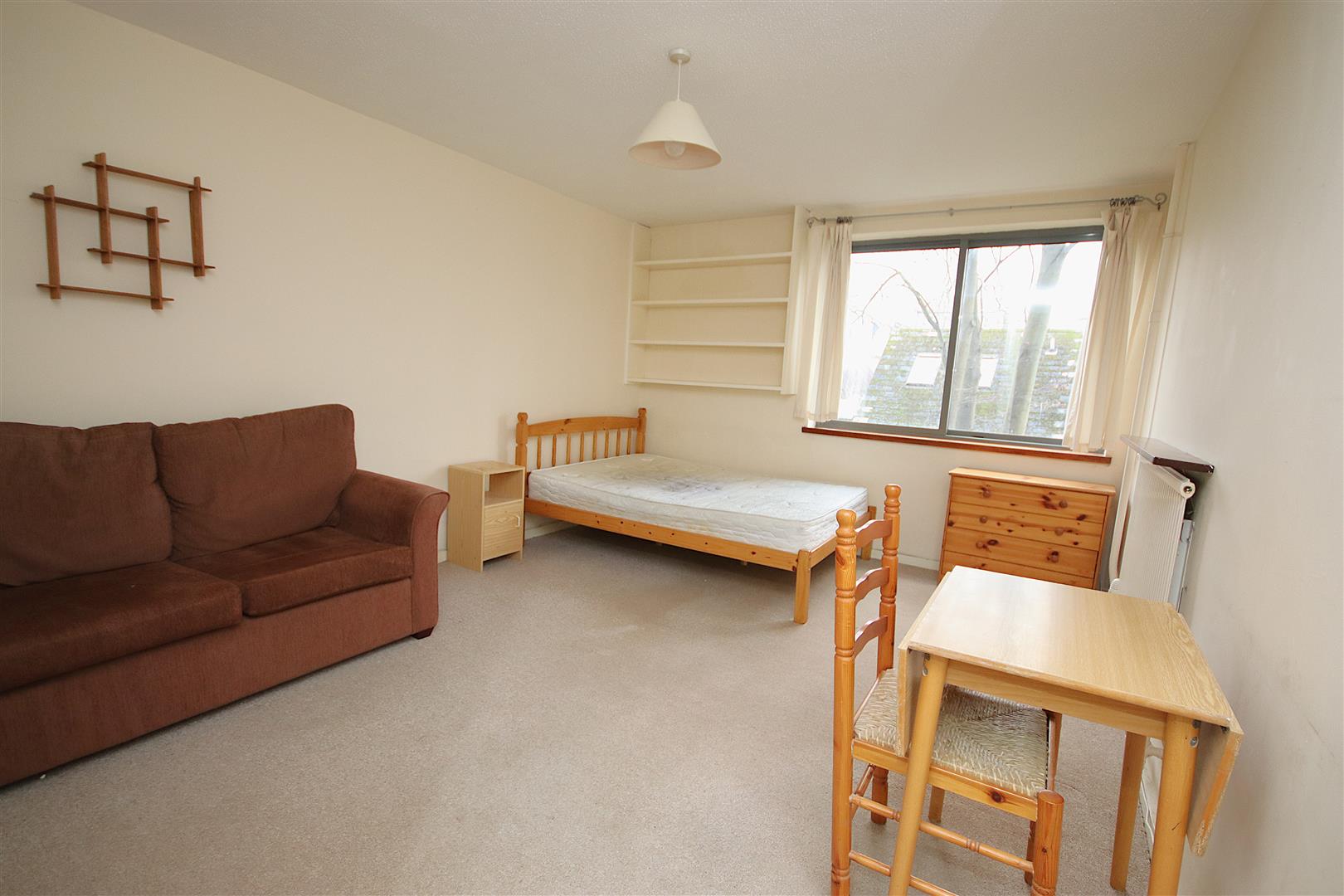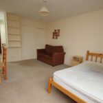 Open plan living/bedroom area with storage cupboards