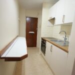 Small kitchen area with two ring electric hob, oven and fridge