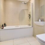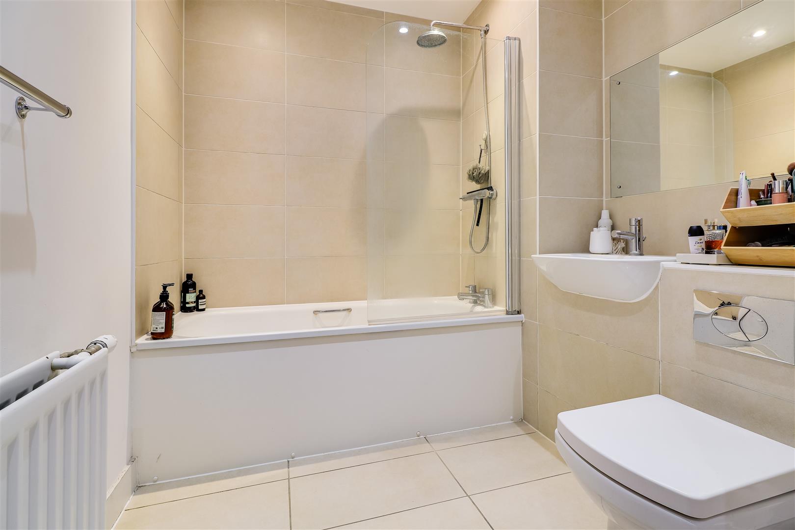The stylish three piece bathroom has a shower and glass screen over the bath and features tiled walls and flooring as well as a large inset mirror and recessed spotlighting.