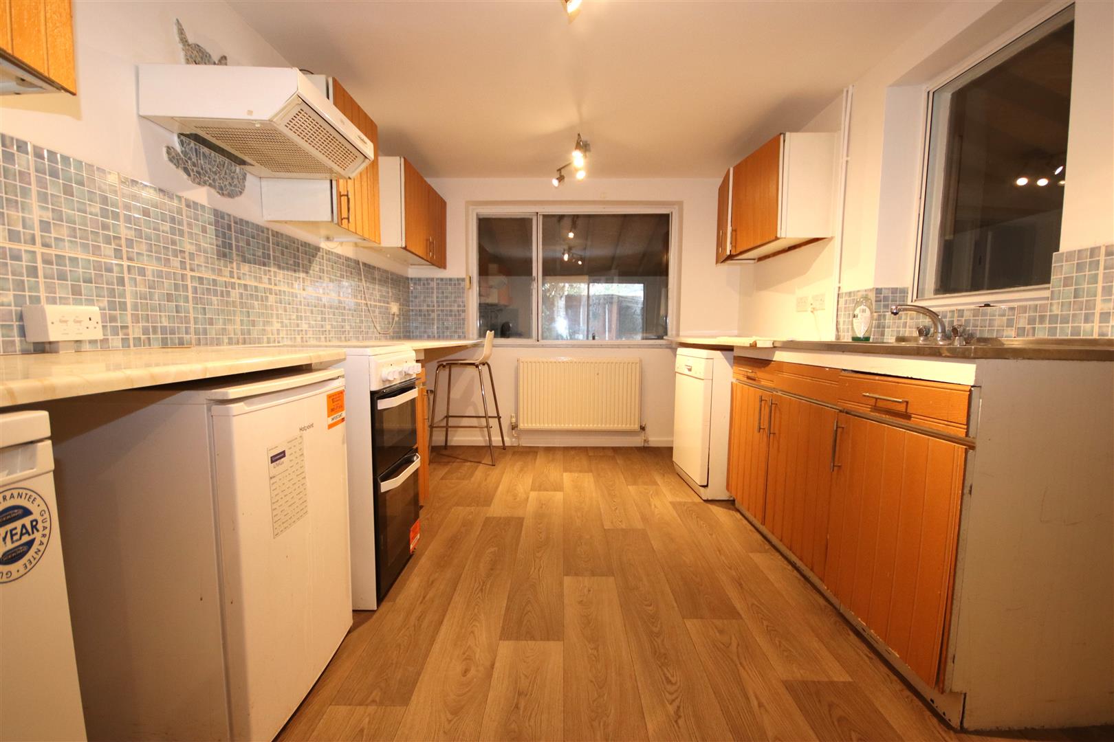 Large kitchen with electric cooker, fridge, freezer