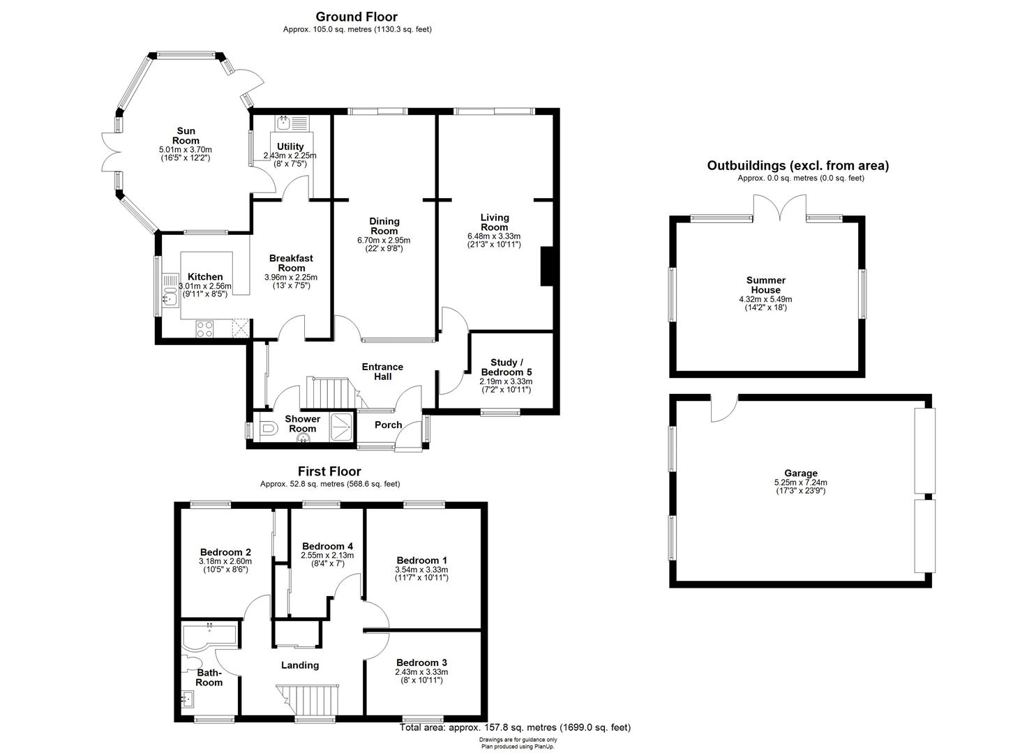 The superb wrap around lawned gardens include established trees and shrubs and a large patio terrace. The substantial timber summer house measures approximately 18ft x 14ft.