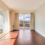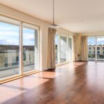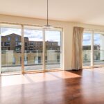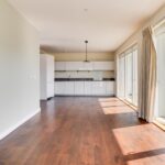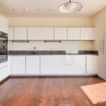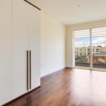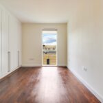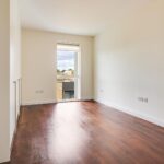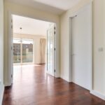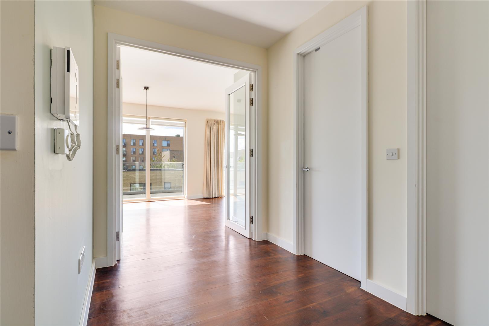 Spacious hallway with dark wood flooring, which continues throughout the apartment. The central hallway, with video intercom entry phone provides access to all rooms and contains a large built in cupboard