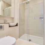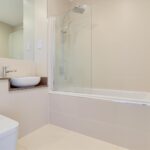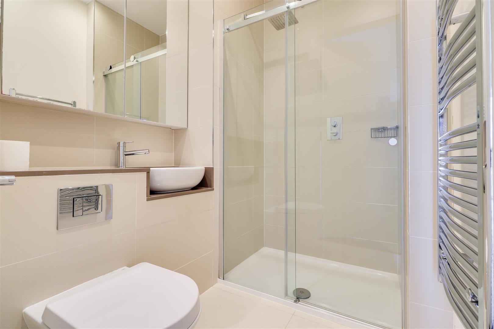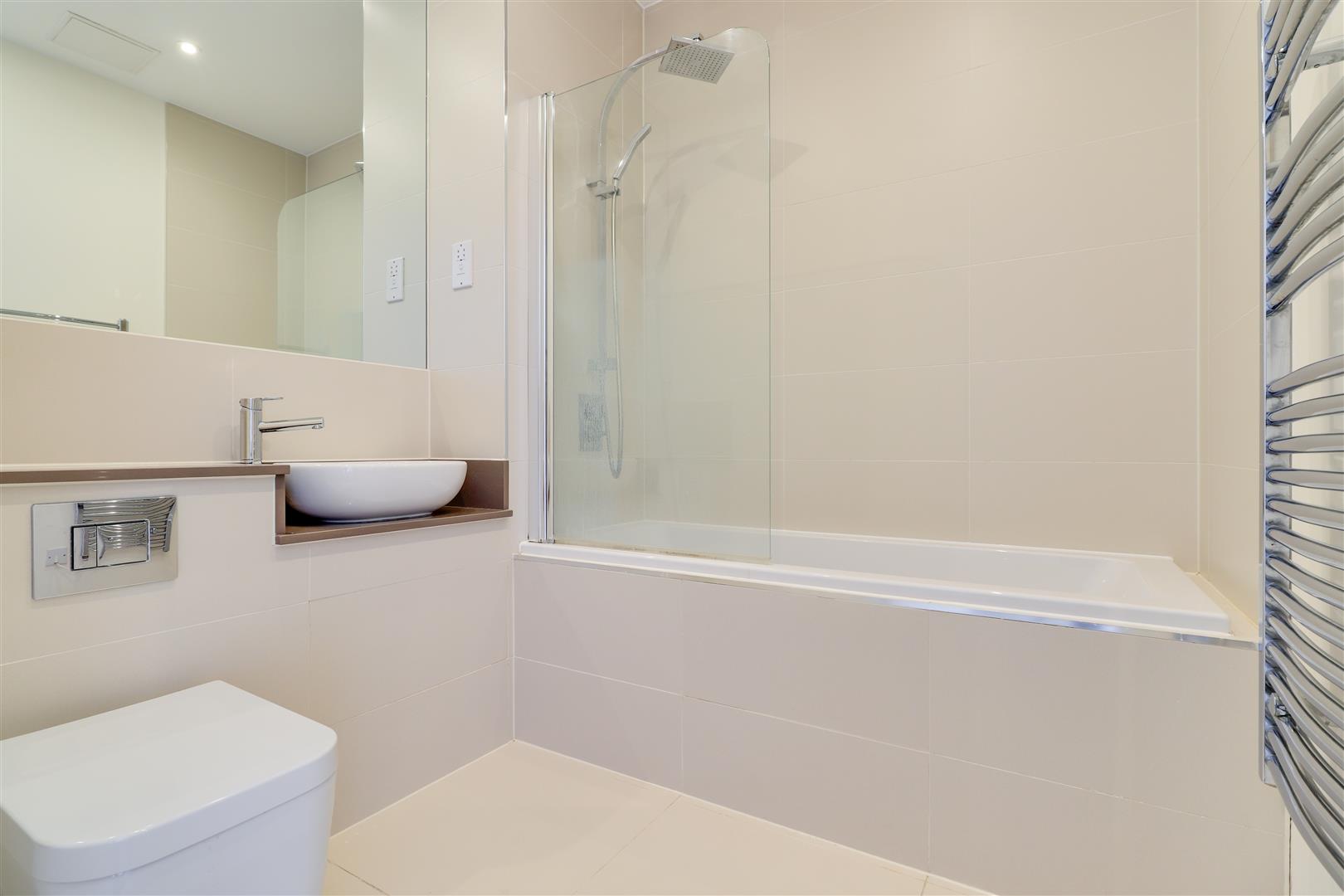 Main bathroom with shower over bath, WC, heated towel rail and hand basin