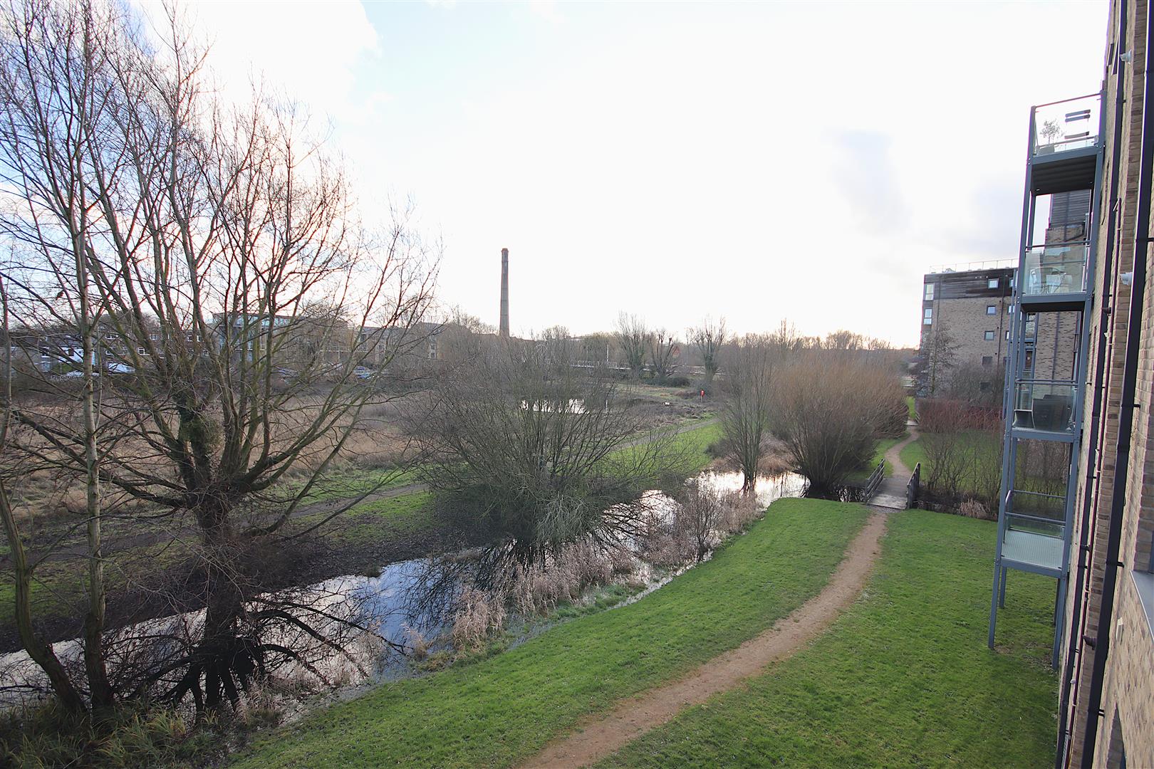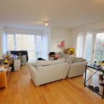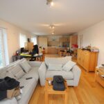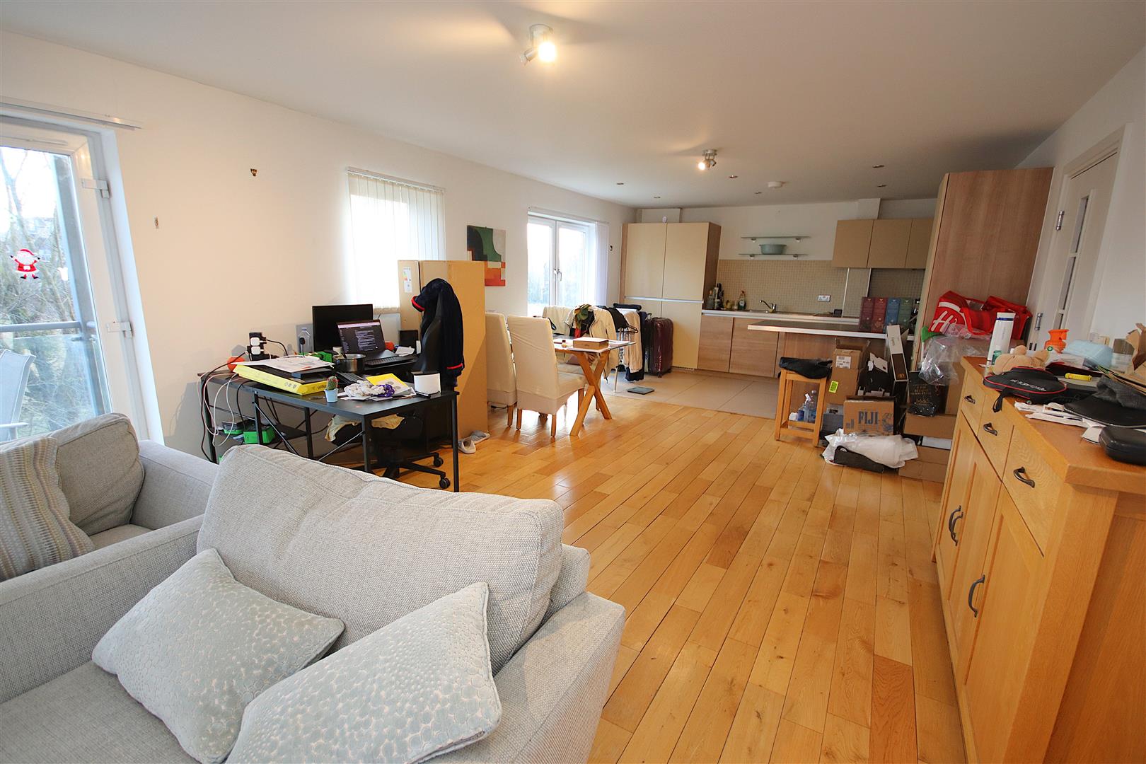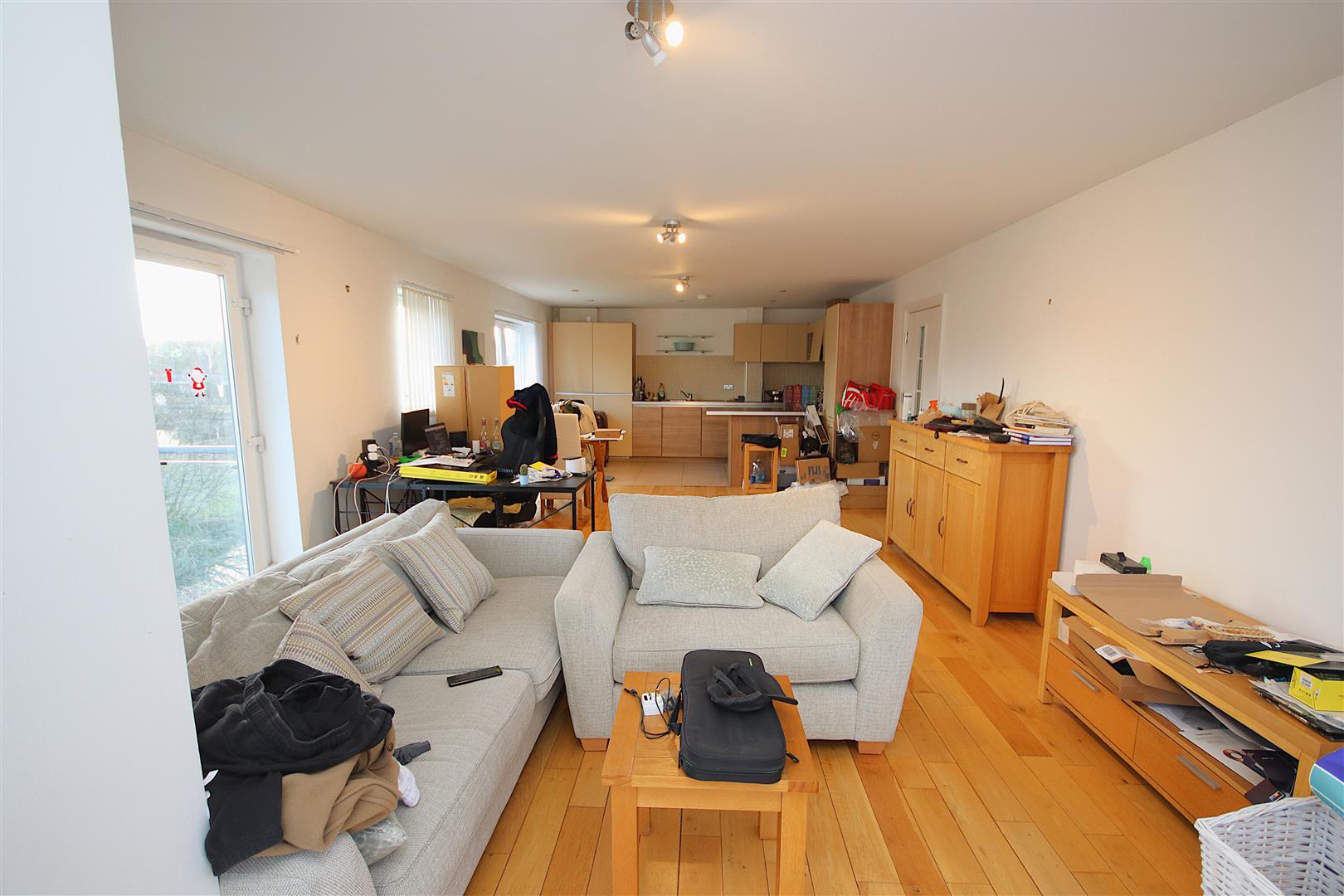 Spacious open plan living room/kitchen with multiple windows offering lots of natural light with French doors leading to a private balcony area overlooking the river.