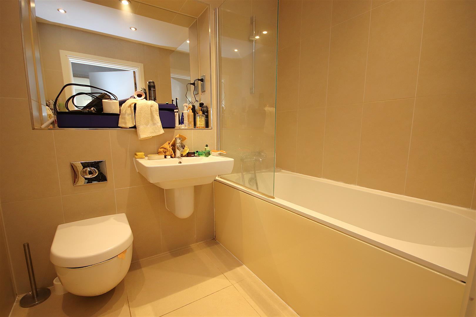 Master bathroom which is fully tiled with shower over bath, WC and hand basin