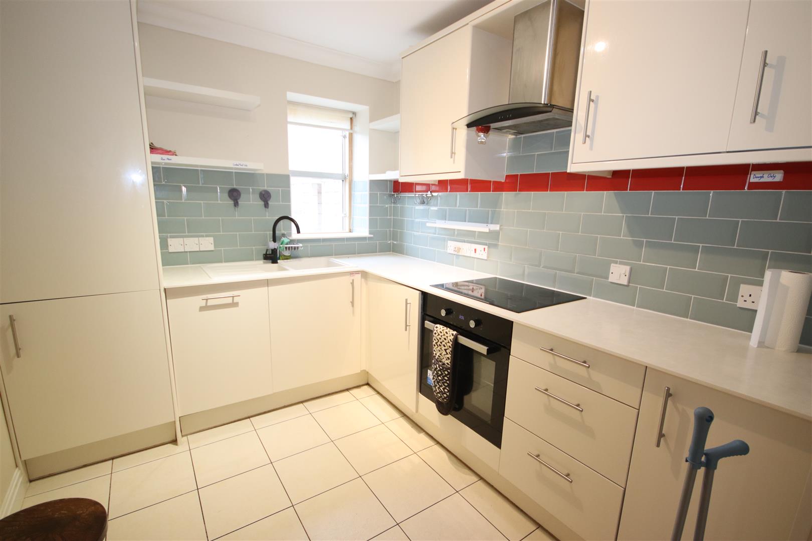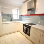 Kitchen fitted with electric induction hob and oven, integrated slimline dishwasher, fridge freezer and washing machine