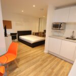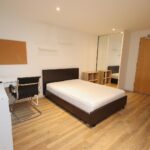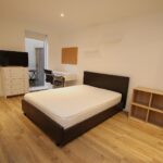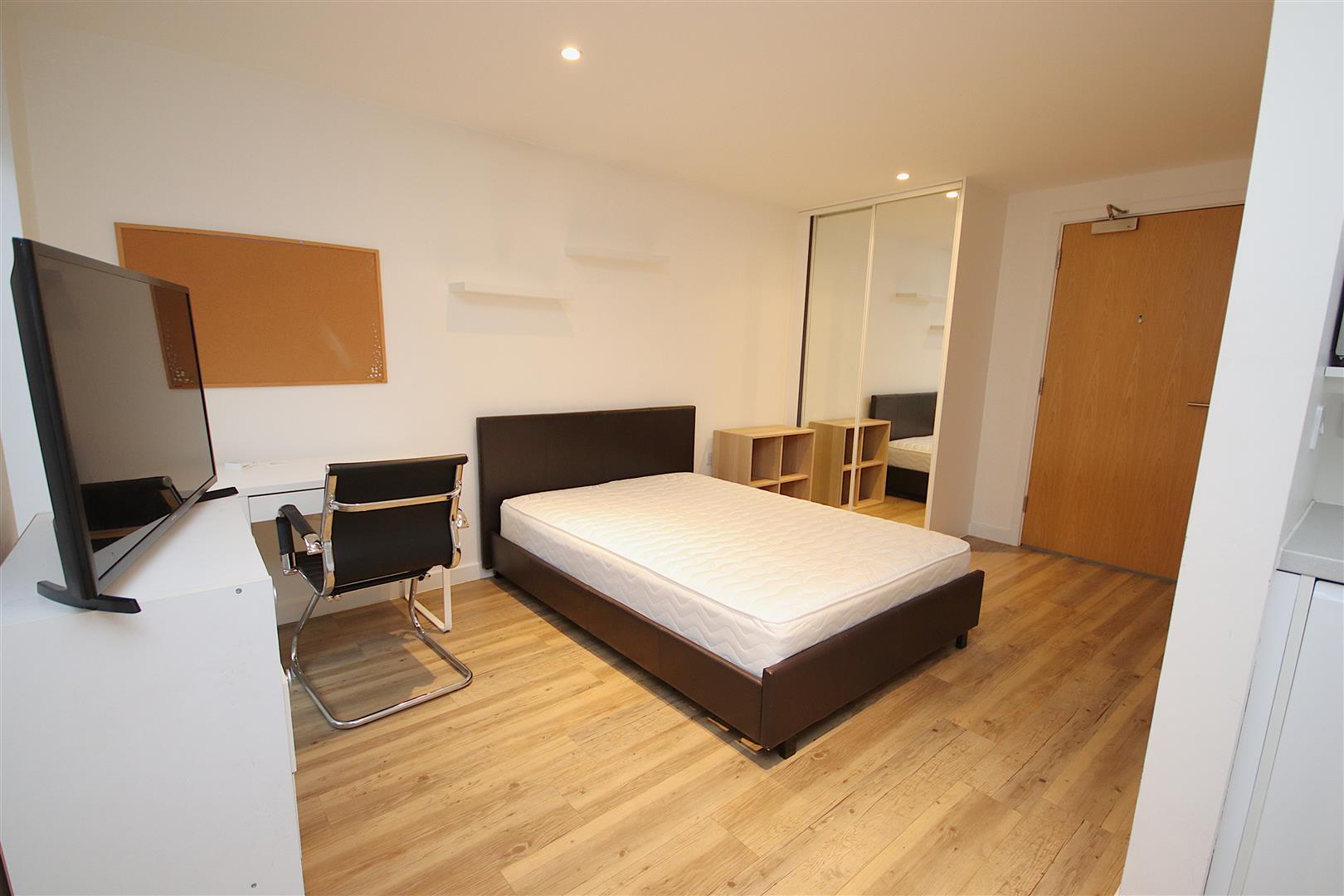 An open plan living space with mirrored fitted wardrobes, side table, desk with chair, chest of drawers, TV and double bed with mattress.