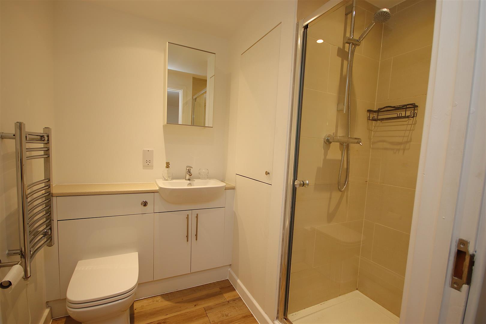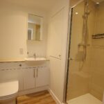 Modern shower room with shower enclosure, WC, hand basin with storage, mirror and heated towel rail