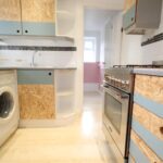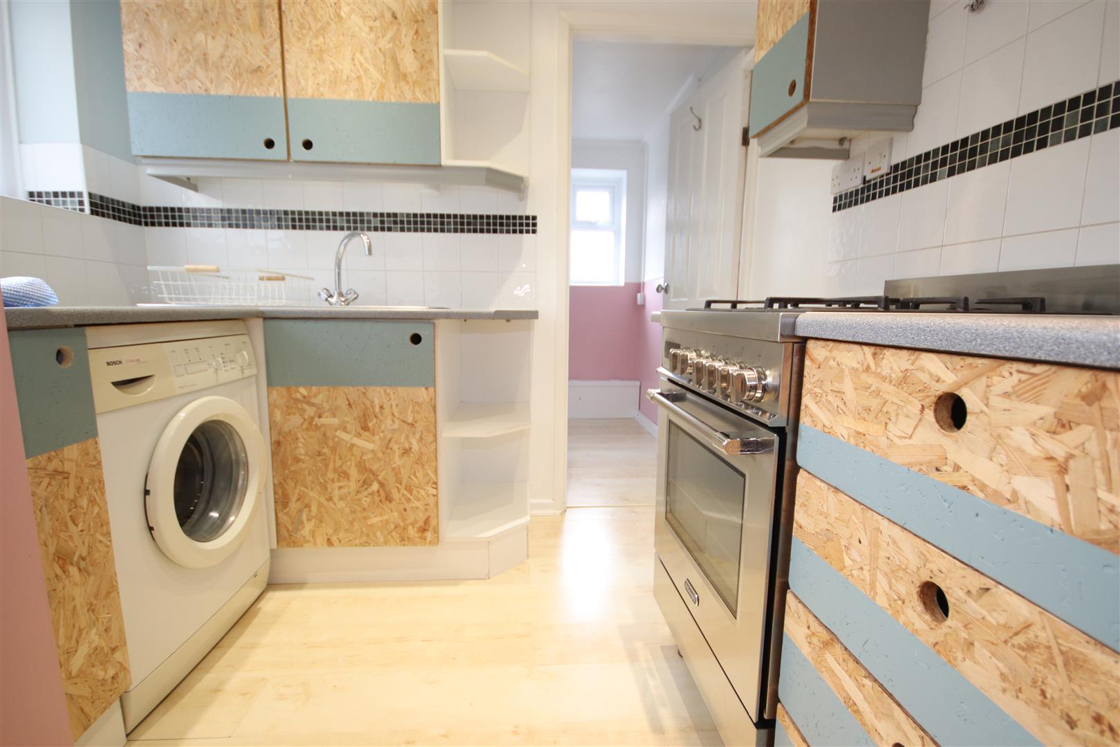 Rear kitchen fitted with gas hob and electric oven, fridge freezer and washing machine