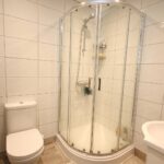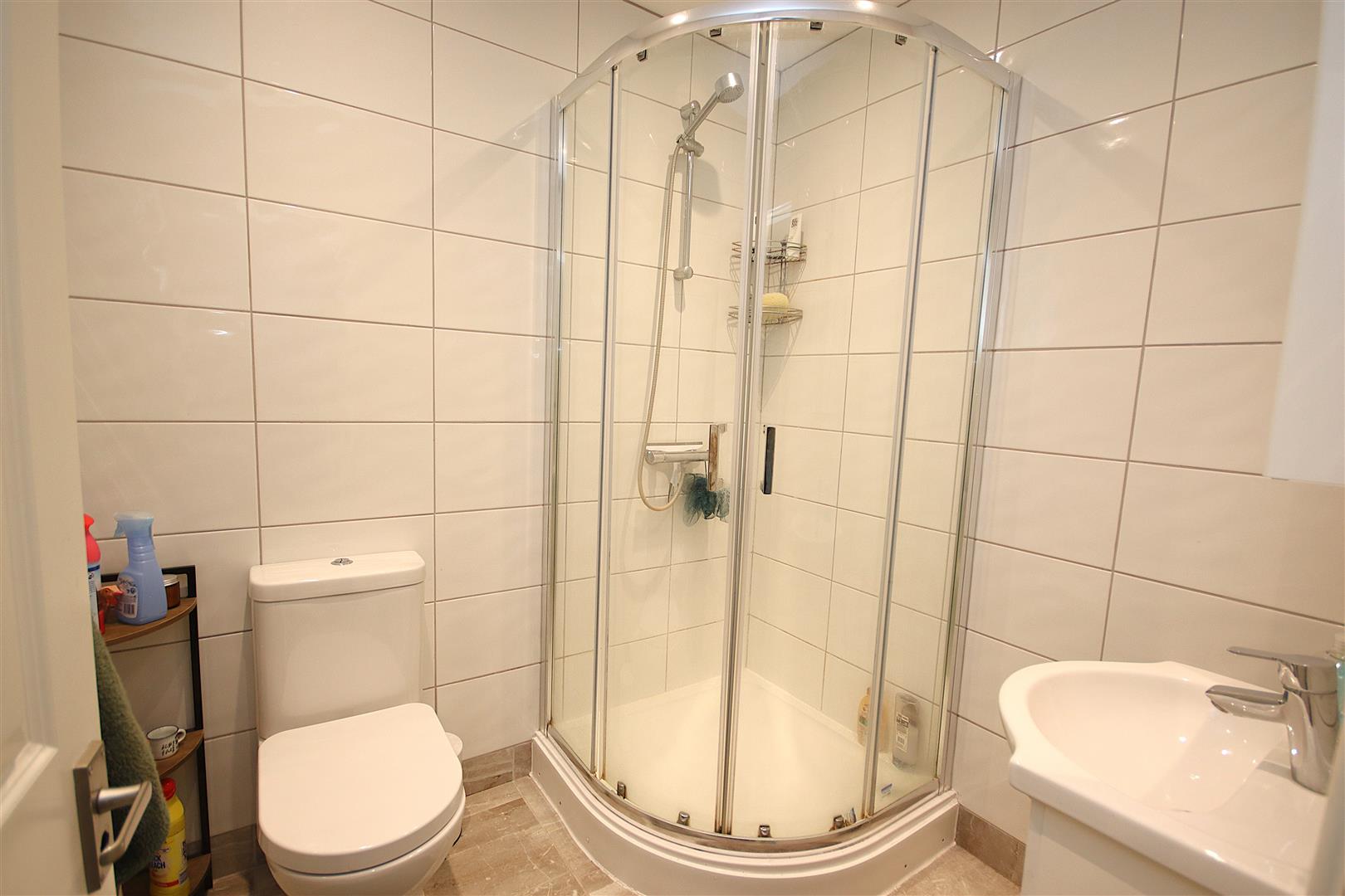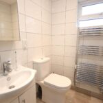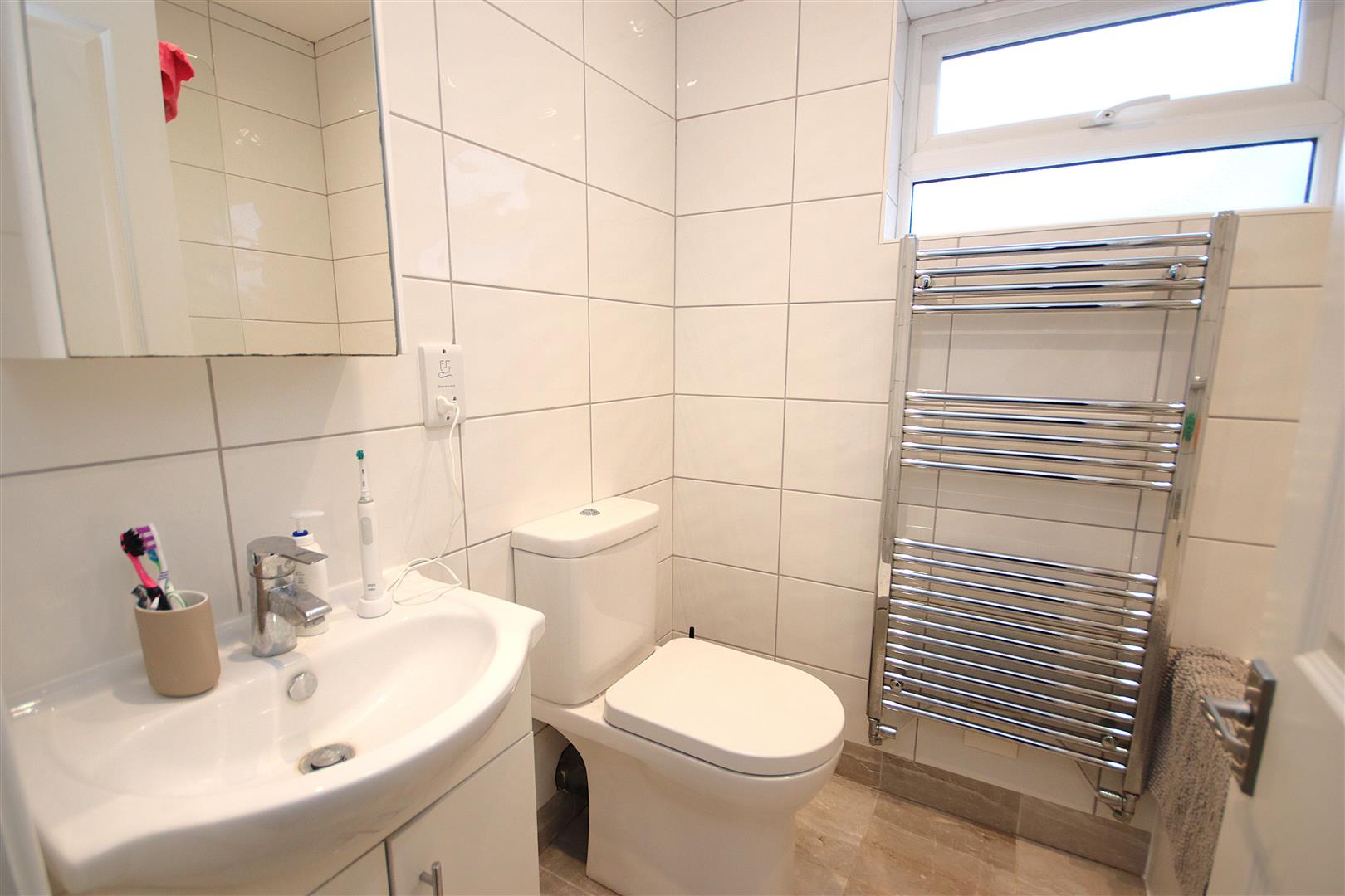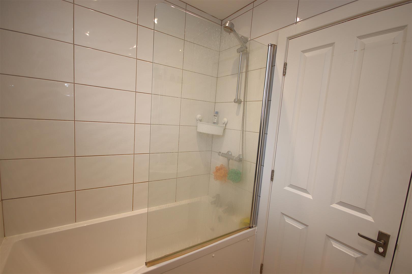 Bathroom with shower over bath, WC, hand basin and heated towel rail.