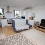 Spacious open plan kitchen/living room with wood laminate flooring. The modern kitchen is equipped with an electric hob and oven with extractor hood and a range of integrated appliances including a slimline dishwasher, washer/drier and under counter fridge and freezer.