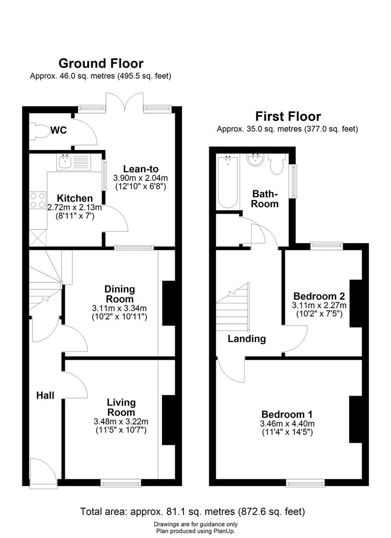 Accommodation in detail. Ground floor timber and glazed front door with fan light over, entrance hall radiator. Sitting room with widow to the front elevation and radiator. Dining room with stairs to the first floor and a radiator. Kitchen with sink unit, range of wall and base storage units, gas hob, electric oven, plumbing for washing machine and fridge space, gas-fired boiler serving central heating and hot water. Lean to with doors to the rear garden. WC. First floor landing 2 bedrooms. Bathroom with panel bath with shower over, hand basin and WC, storage cupboard and radiator.