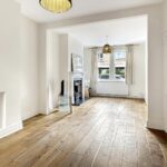 Bright open plan living room with wooden flooring and understairs cupboard