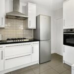 Modern fitted kitchen with integrated electric oven and 5 ring gas hob, fridge freezer and dishwasher