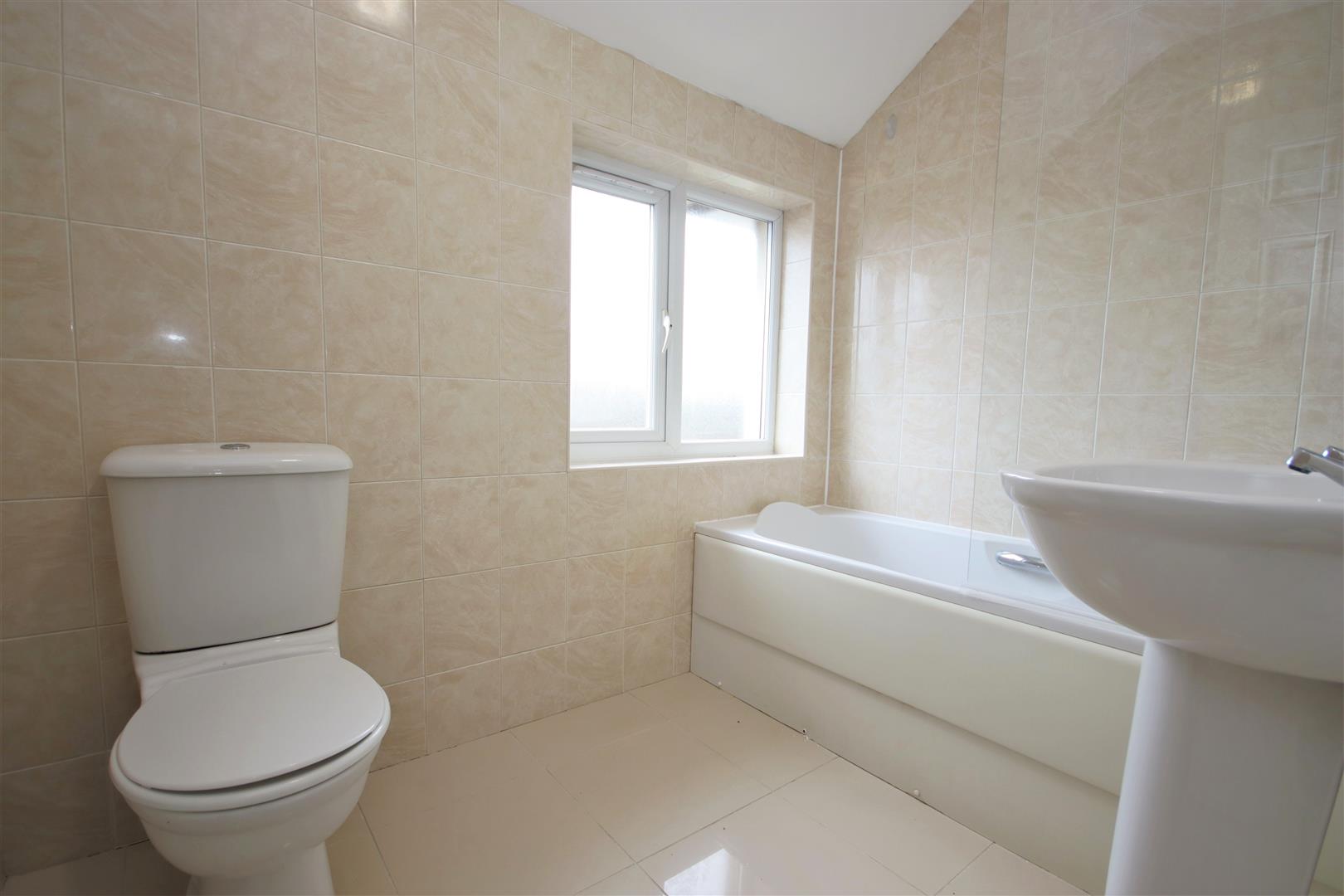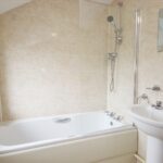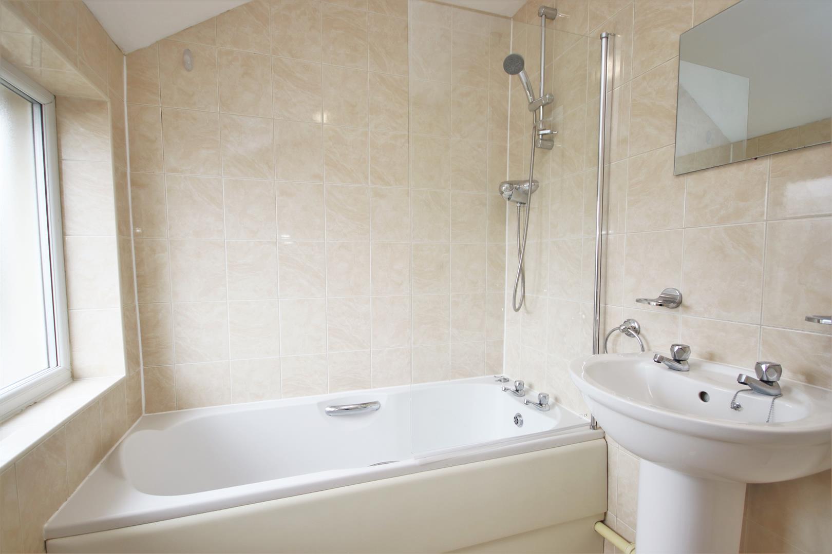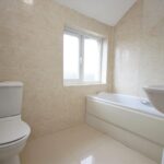 First floor modern bathroom which is mostly tiled with shower over bath, WC and hand basin
