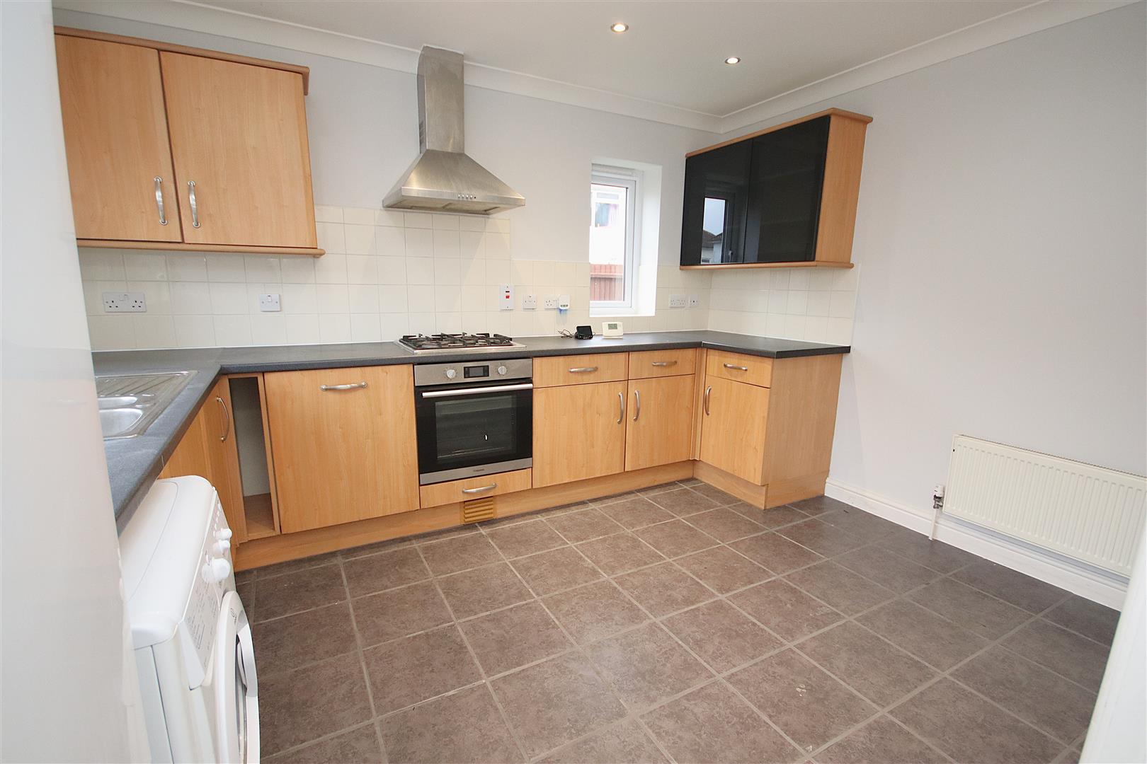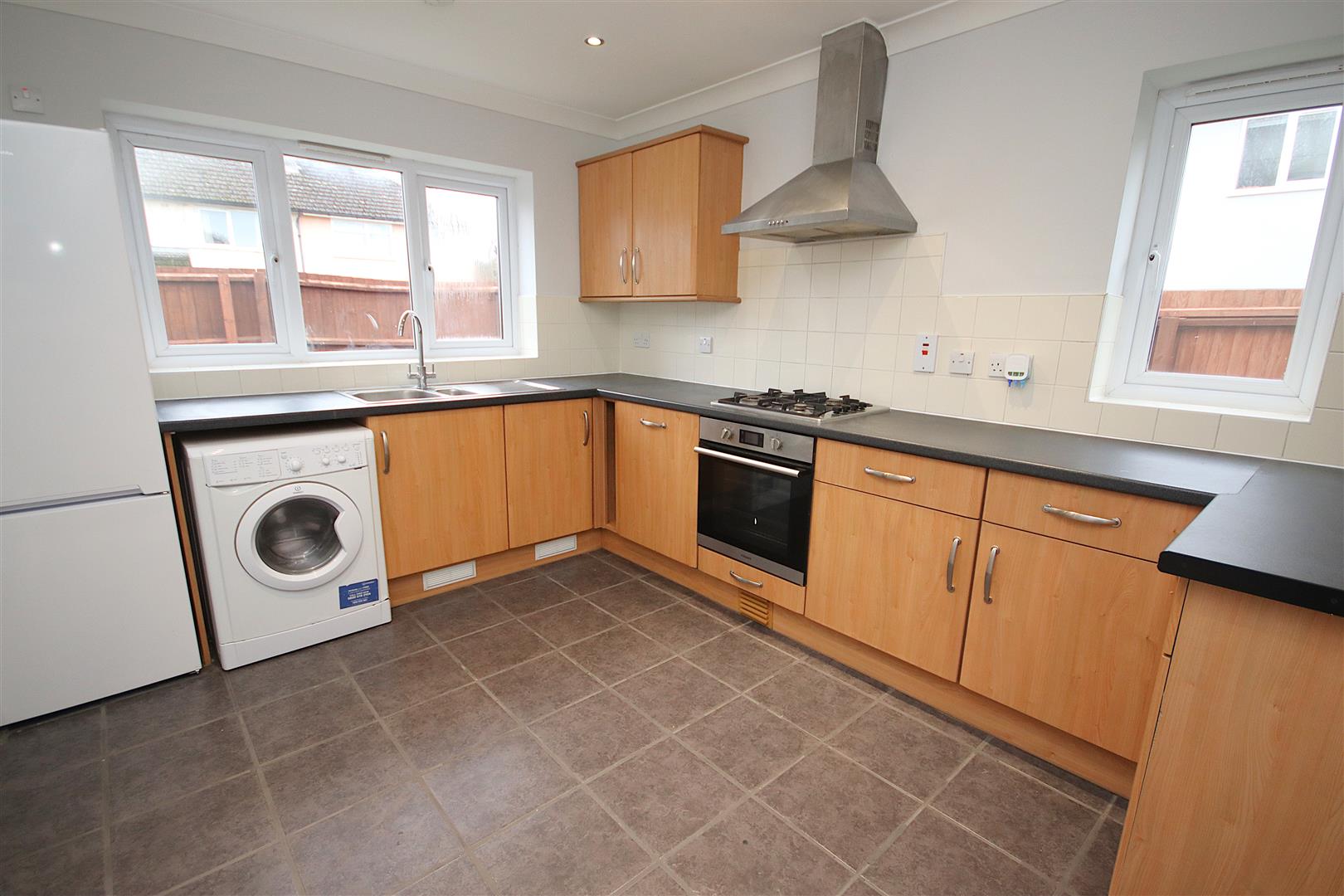 Fitted kitchen with fridge freezer, washer dryer, gas hob and electric oven with extractor fan and dishwasher