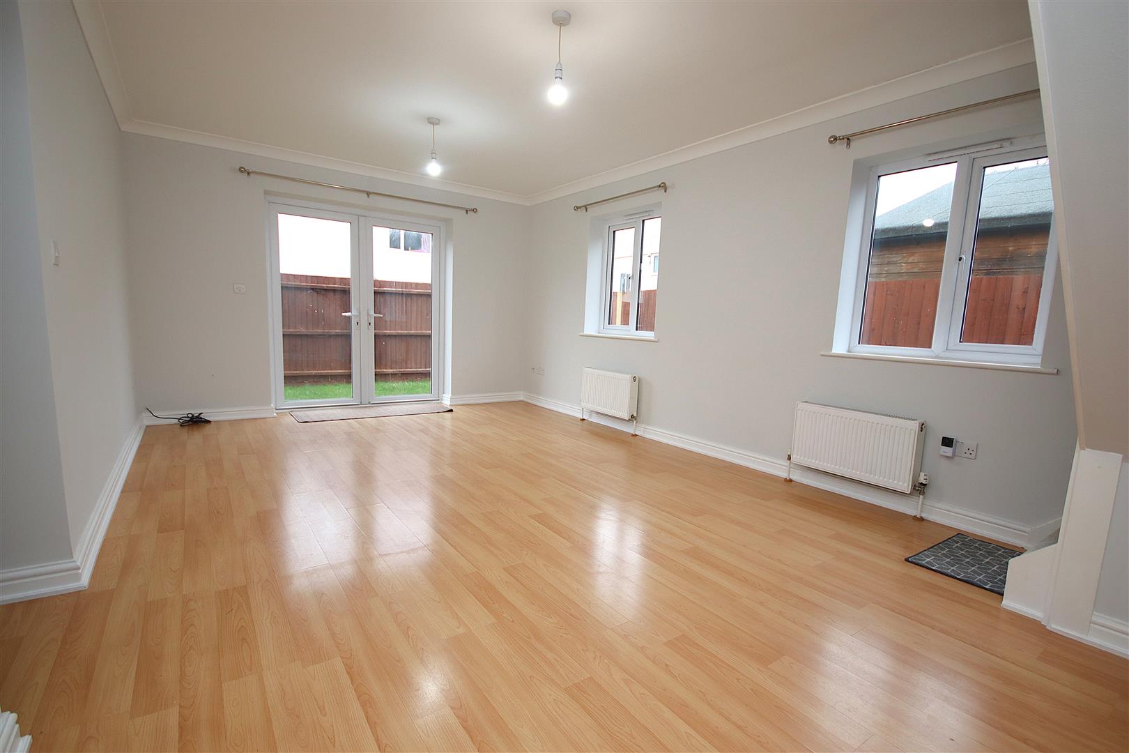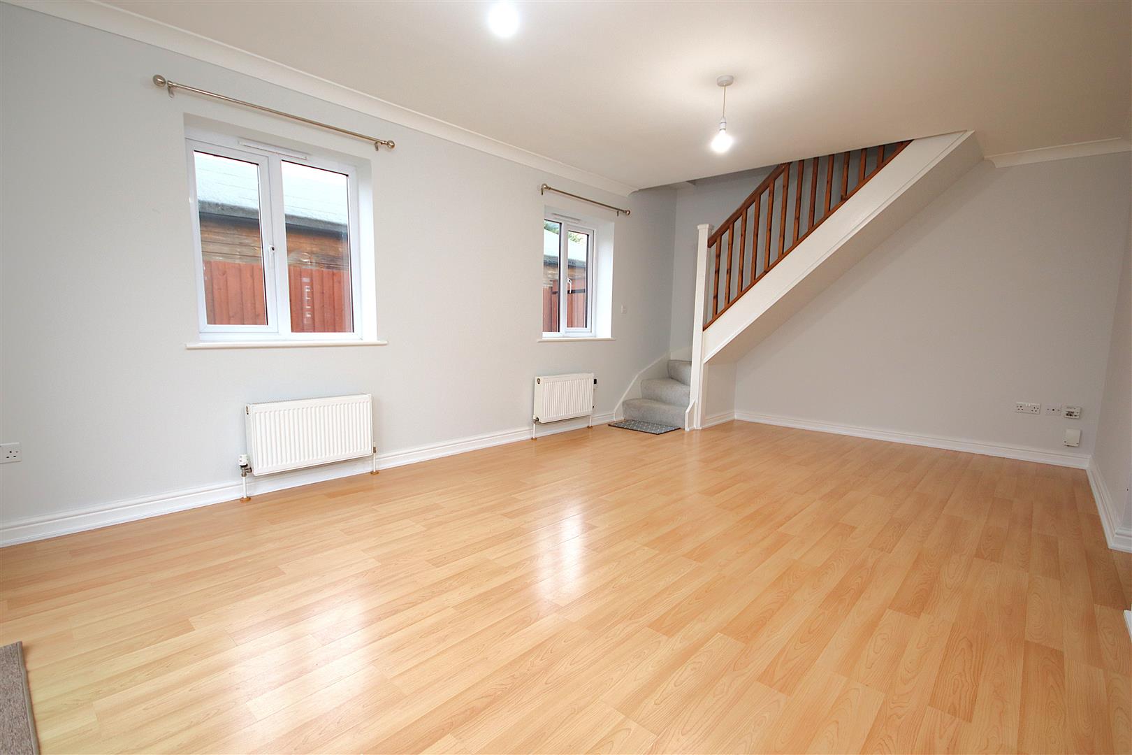 Spacious and sunny living room located to the rear of the house with wood laminate flooring, patio doors giving access to the garden and stairs leading to the first floor