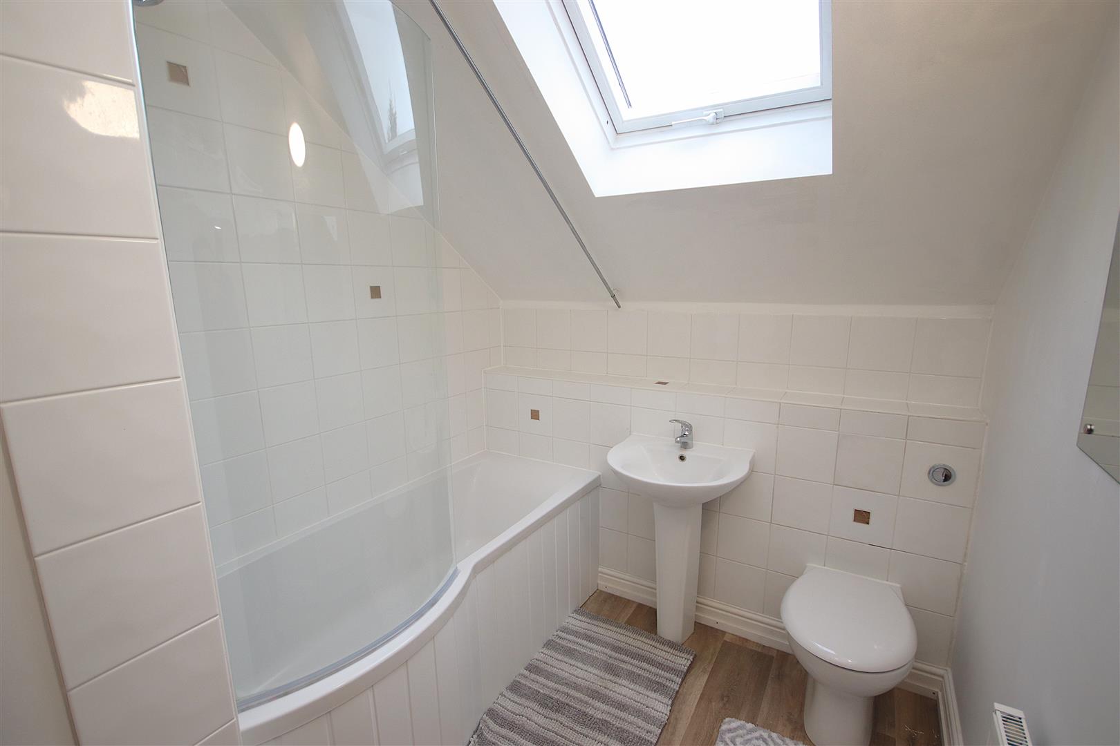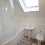 First floor bathroom with shower over bath, WC, hand basin, Veluxe window and cupboard