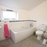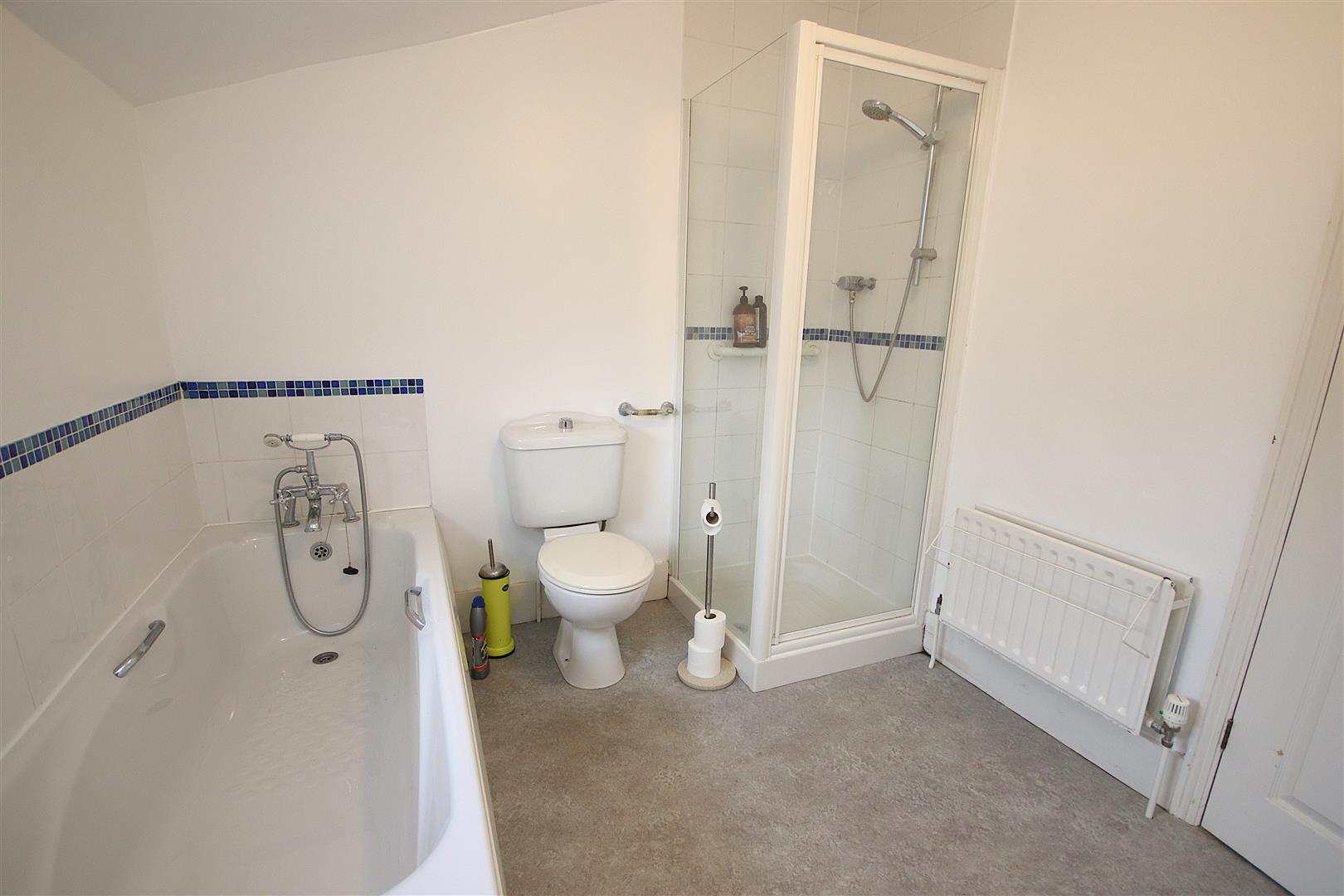 Rear spacious bathroom with bath, separate shower cubicle, WC and hand basin