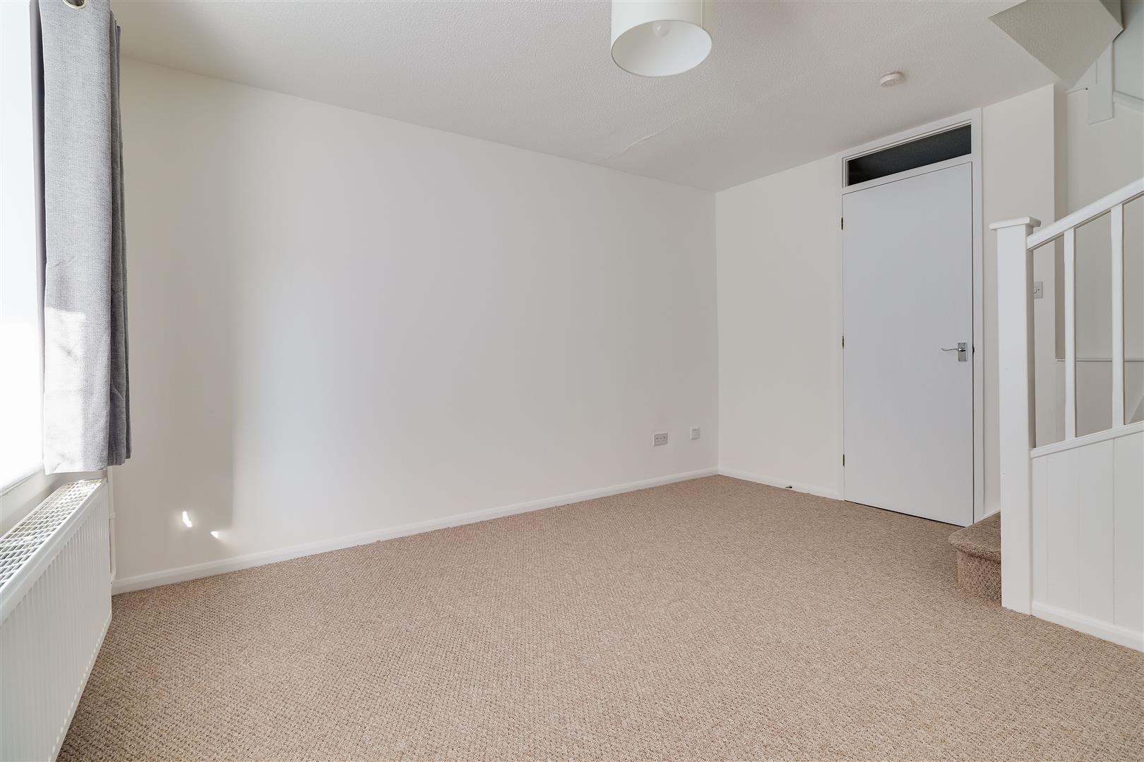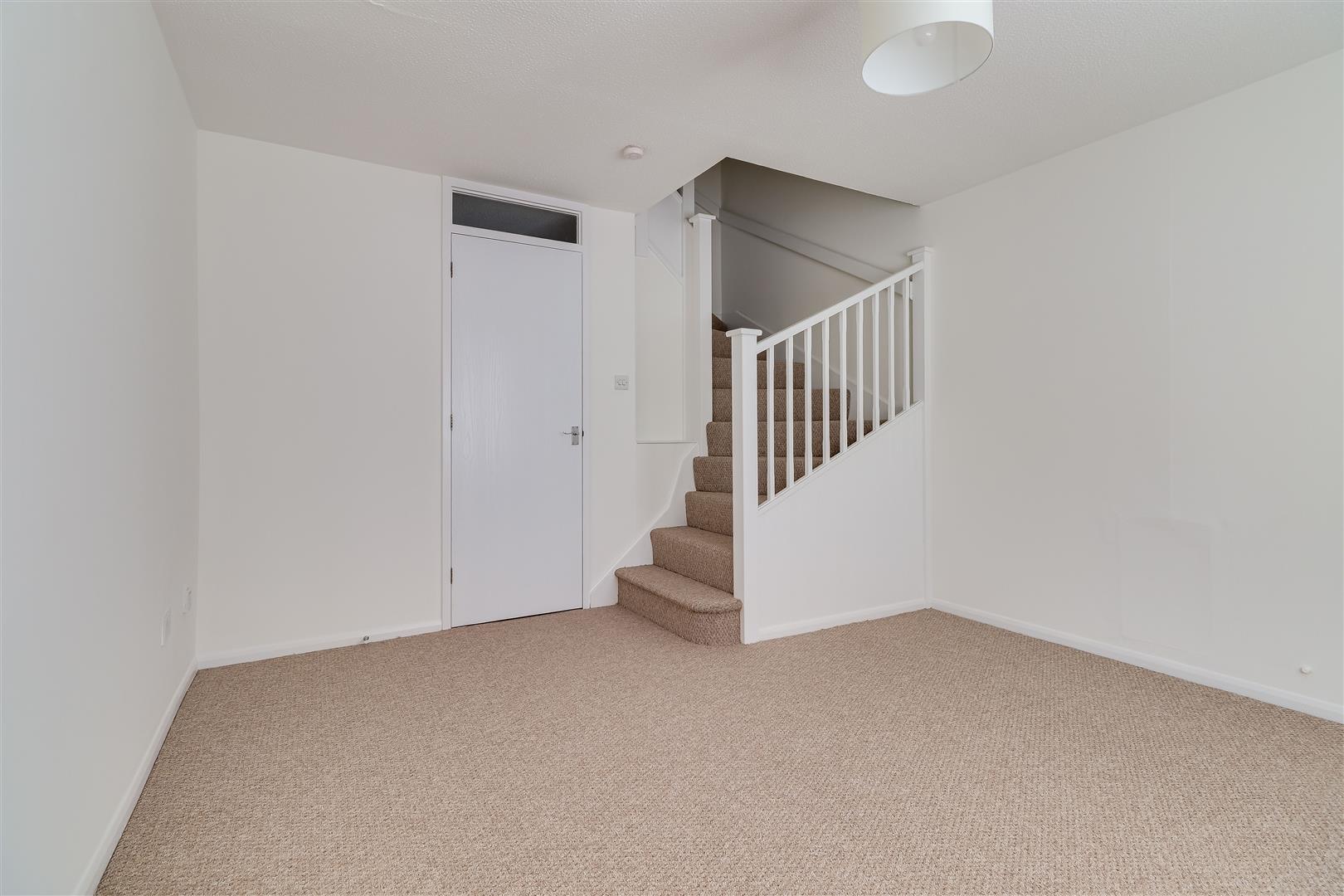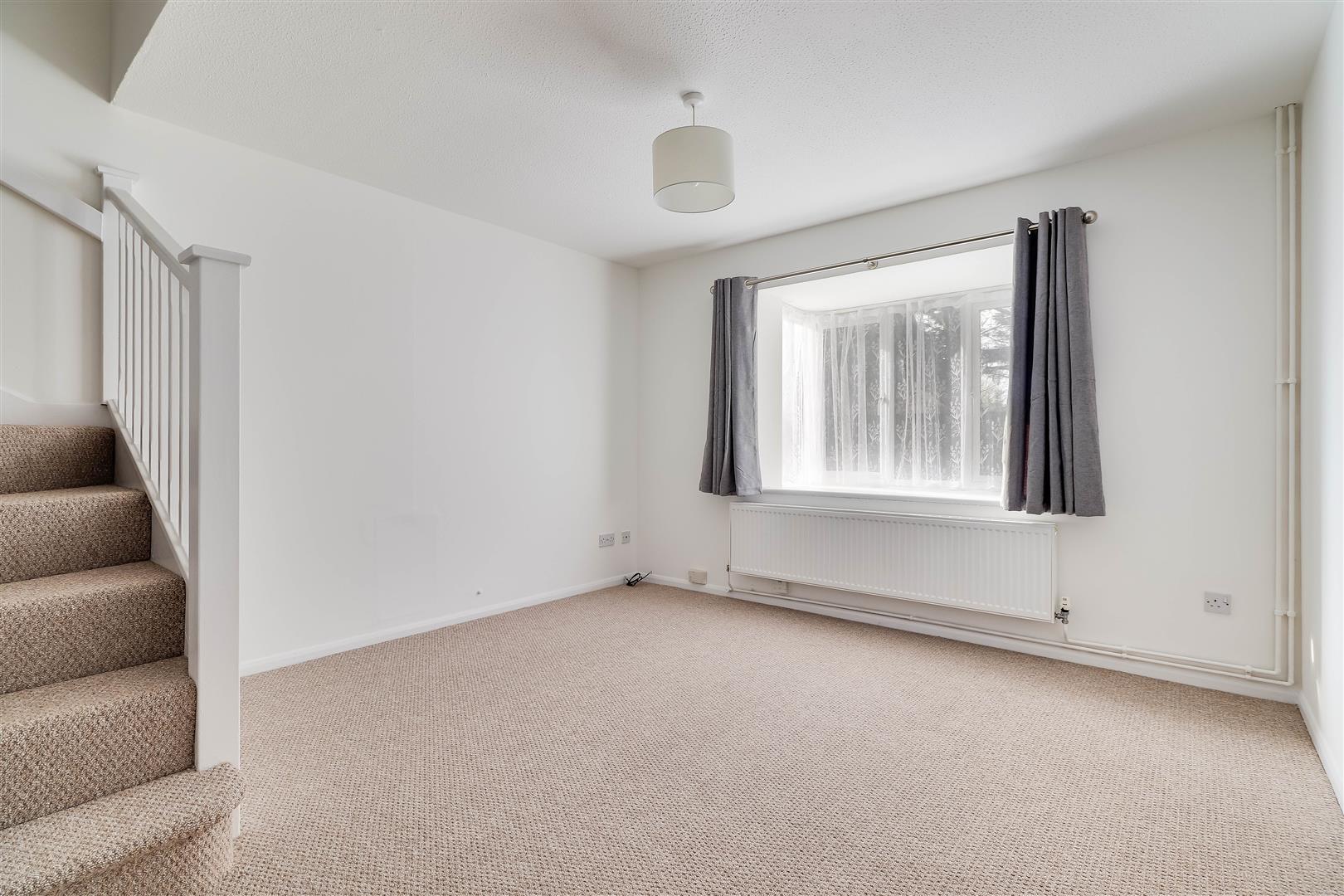 The sitting room has a box bay window, overlooking the garden, and stairs lead up to the first floor.