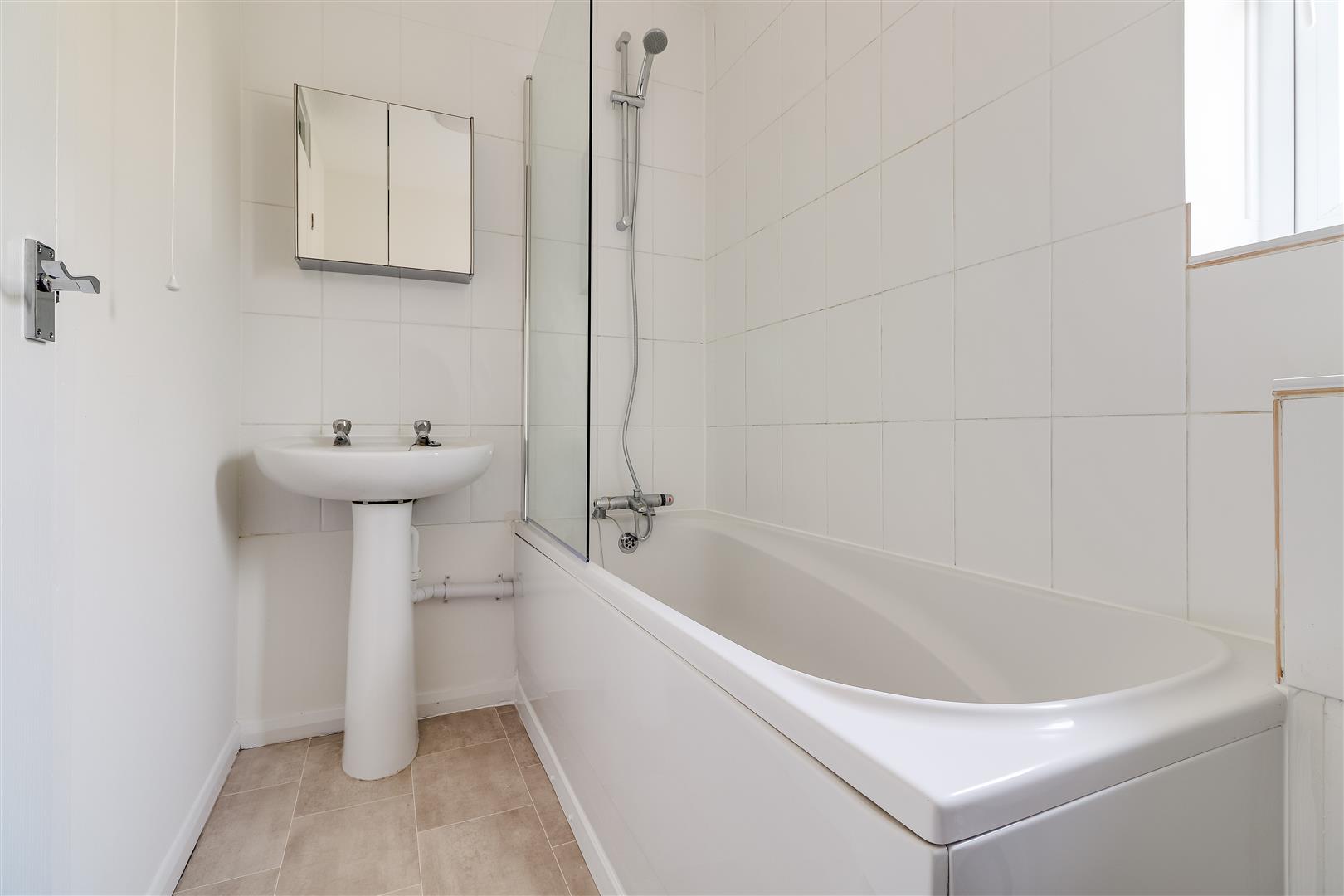 The three piece bathroom comprises a bath with shower over and glass screen, w.c and wash hand basin as well as part tiled walls.