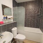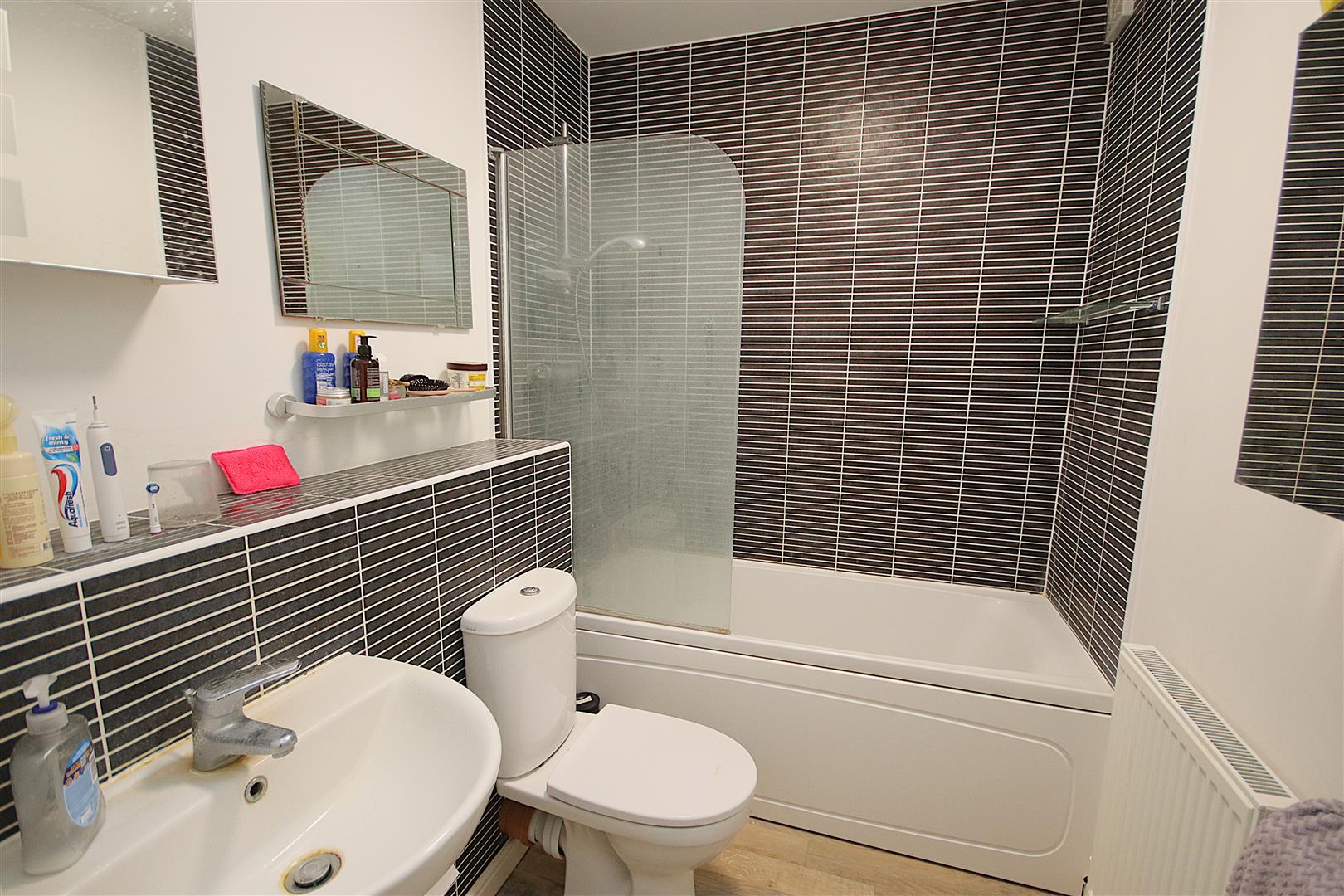 Bathroom with shower over bath, WC and hand basin