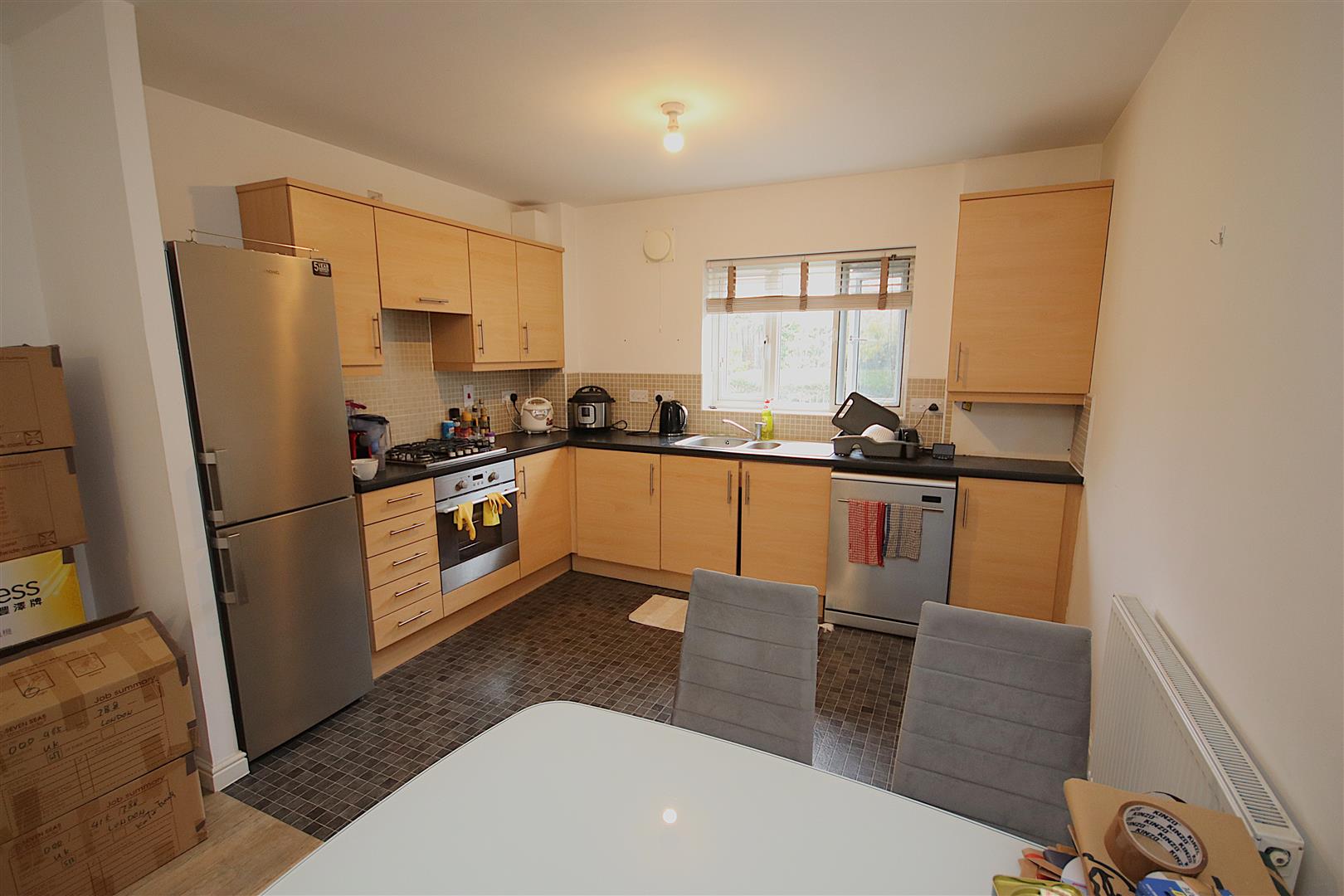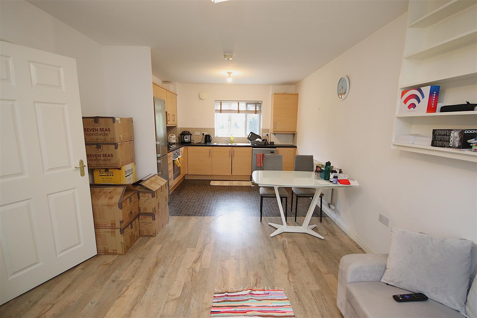Spacious open plan living room/kitchen with gas hob and electric oven, washer-drier, fridge freezer and dishwasher