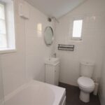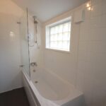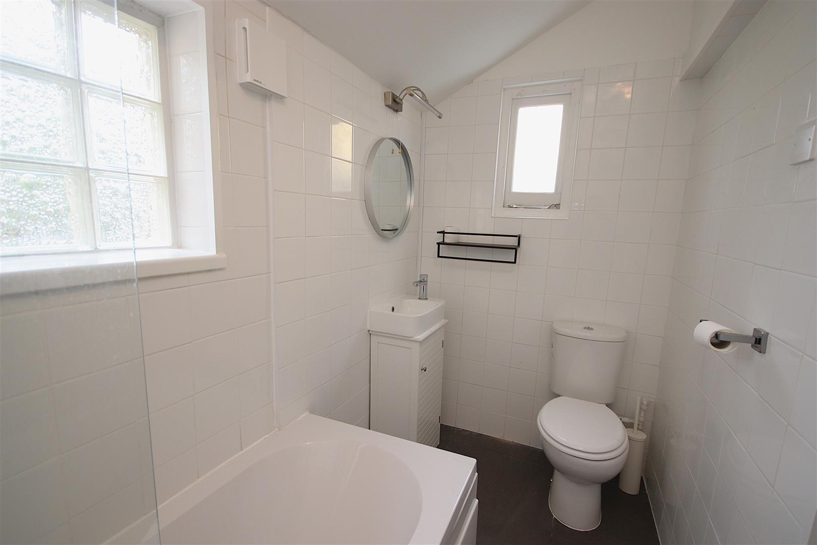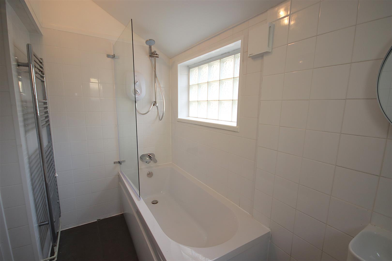 Newly installed ground floor rear bathroom, located off the kitchen with electric shower over bath, heated towel rail, WC and hand basin