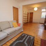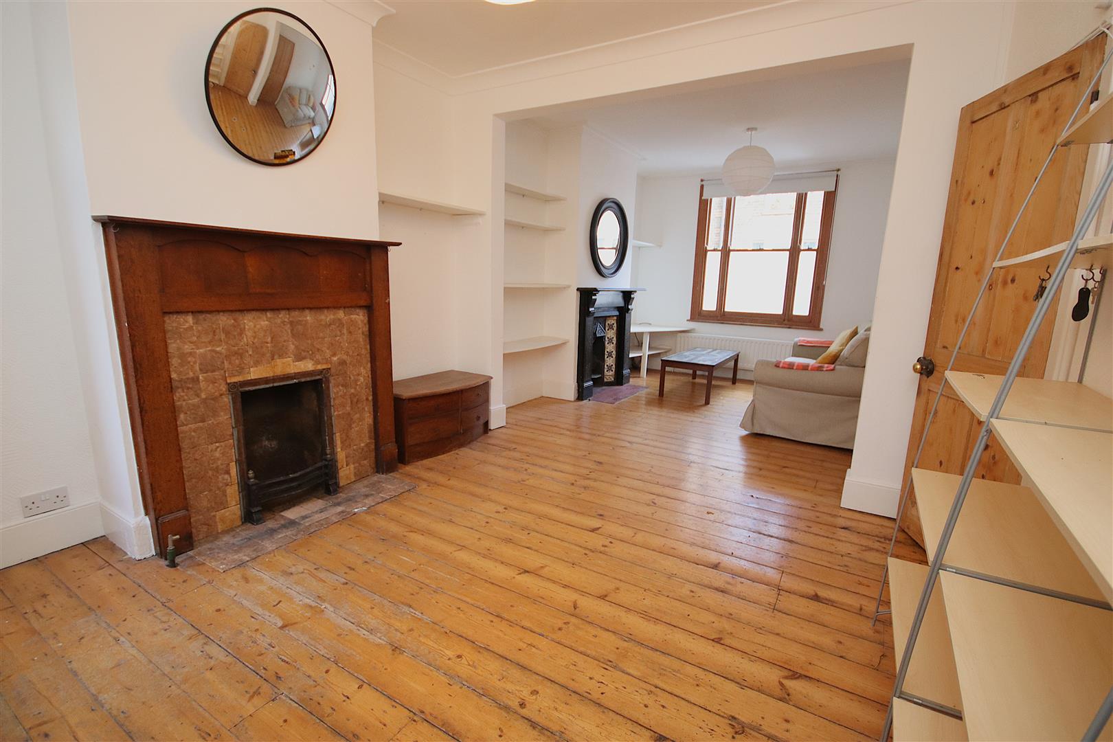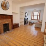 Spacious lounge/diner with two decorative fire places, original floorboards and back door leading to rear enclosed garden