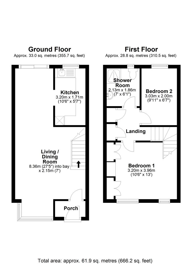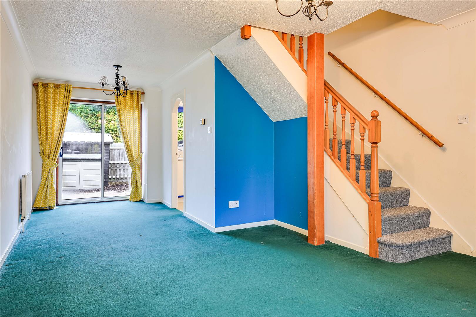 The accommodation in detail. Ground floor, timber and glazed front door to entrance hall, radiator. Sitting/ dining room, patio doors to rear garden, stairs to first floor, bay window to front elevation, and radiator. Kitchen with sink unit, range of wall and base units, electric hob and oven. fridge freezer, plumbing for washing machine. First floor landing, bedroom 1 with a range of fitted wardrobes and a radiator, bedroom 2 radiator. Shower room with shower cubicle, hand basin, WC, and radiator.