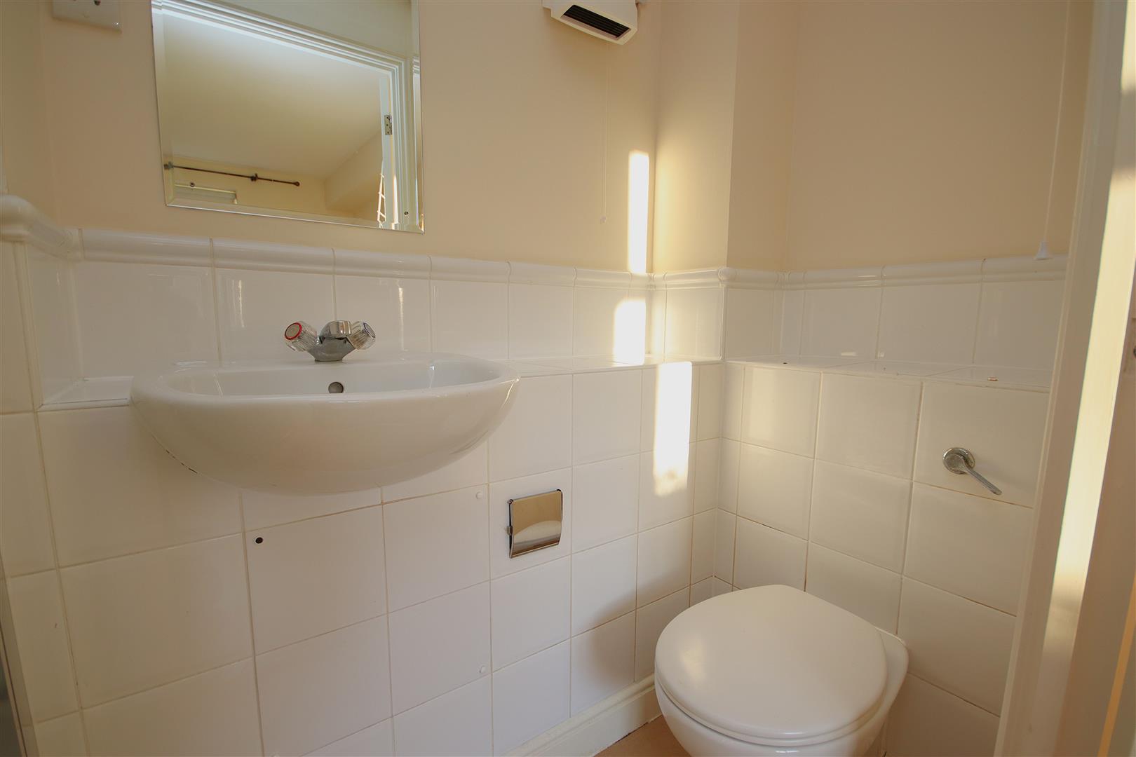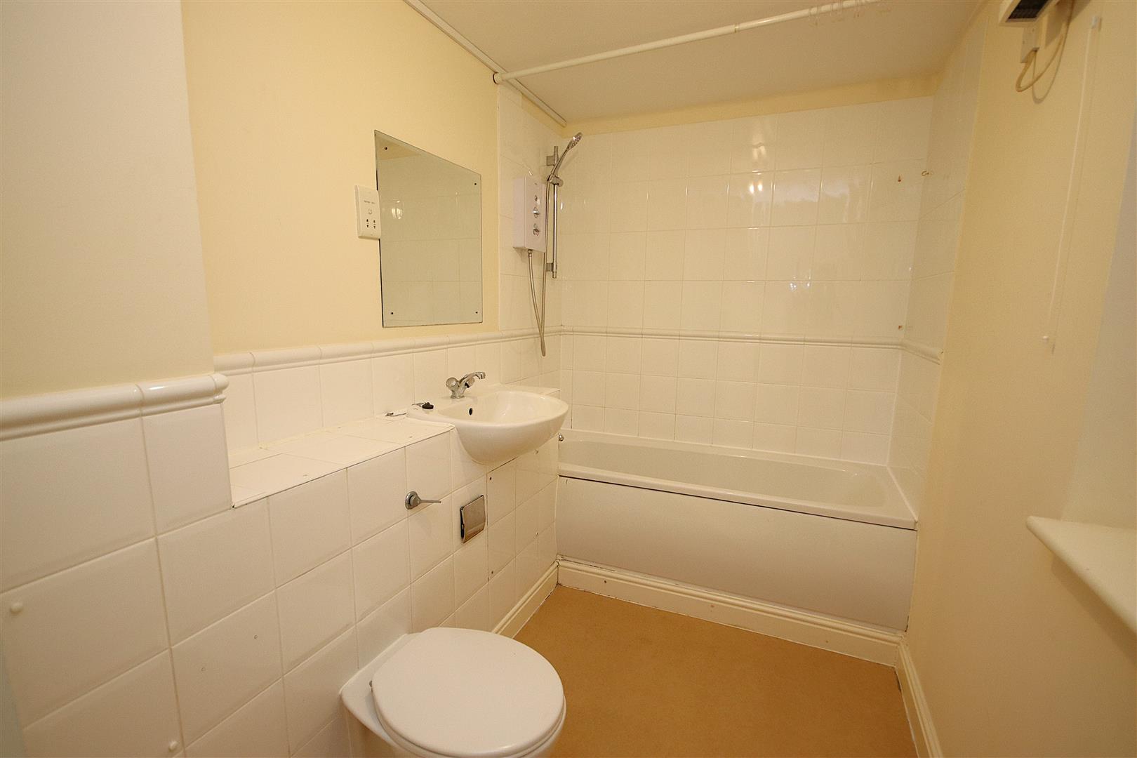 Large bathroom with shower over bath, WC, hand basin and storage cupboard