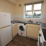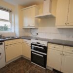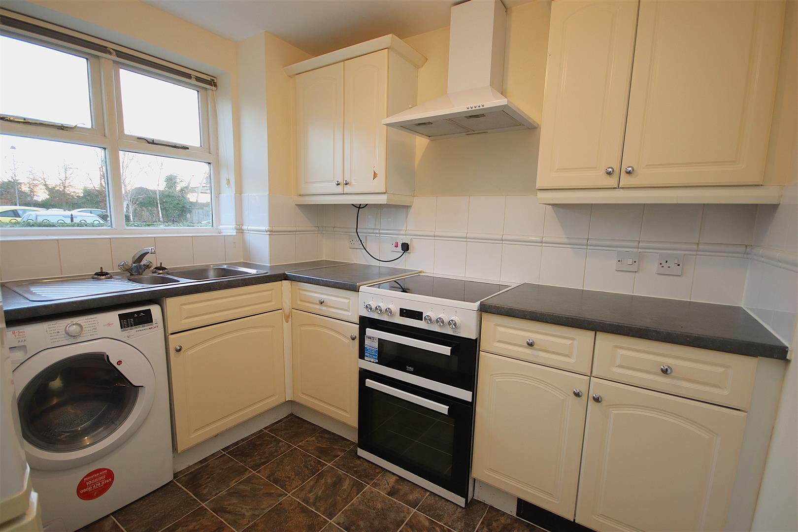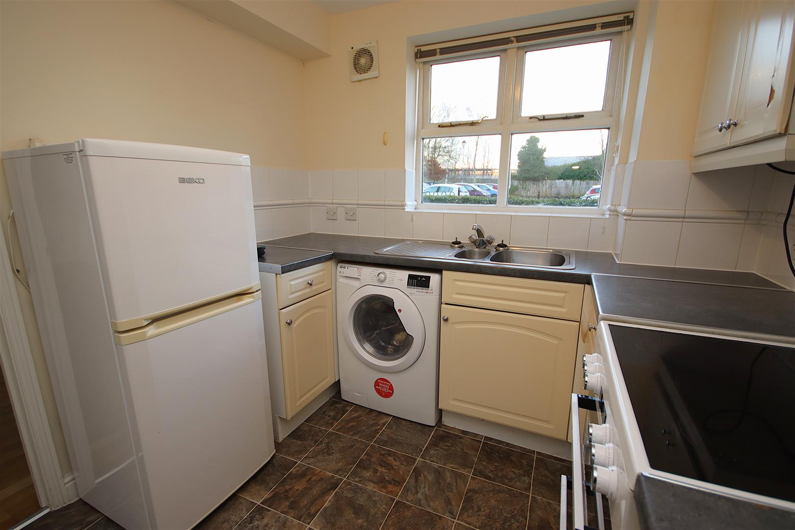 Fitted kitchen located just off the living room with freestanding fridge freezer, washer-drier and electric oven with extractor hood